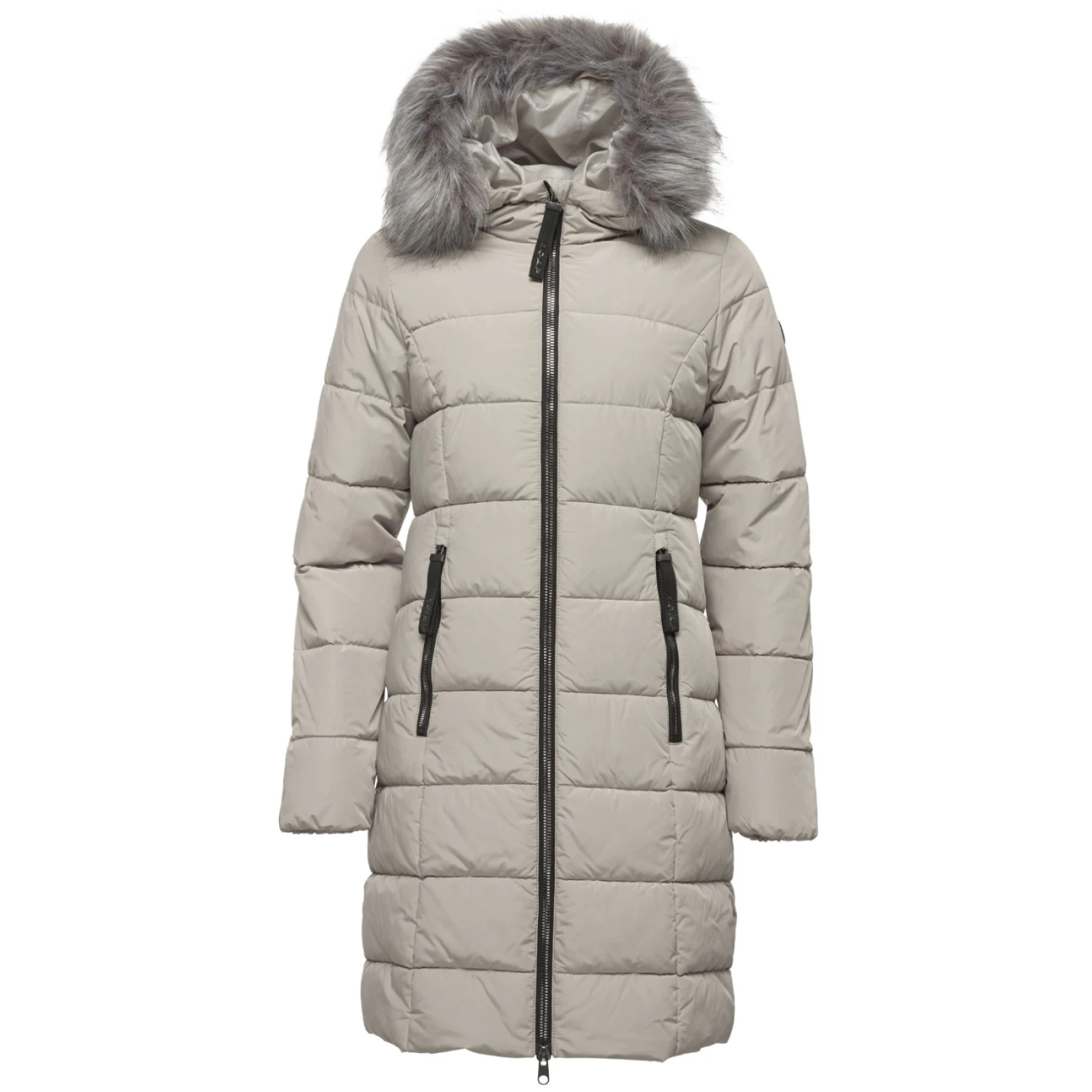 - Capucha de piel desmontable, mangas elásticas