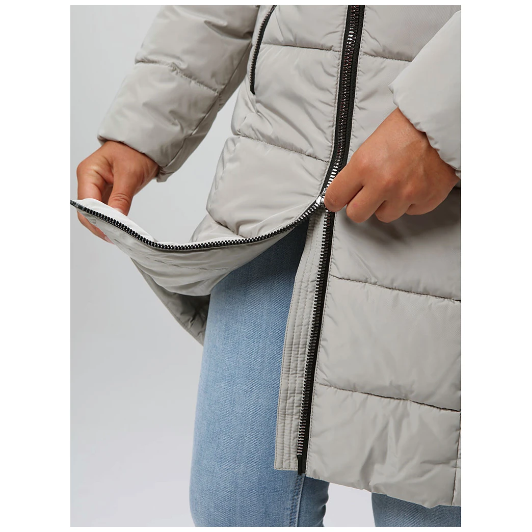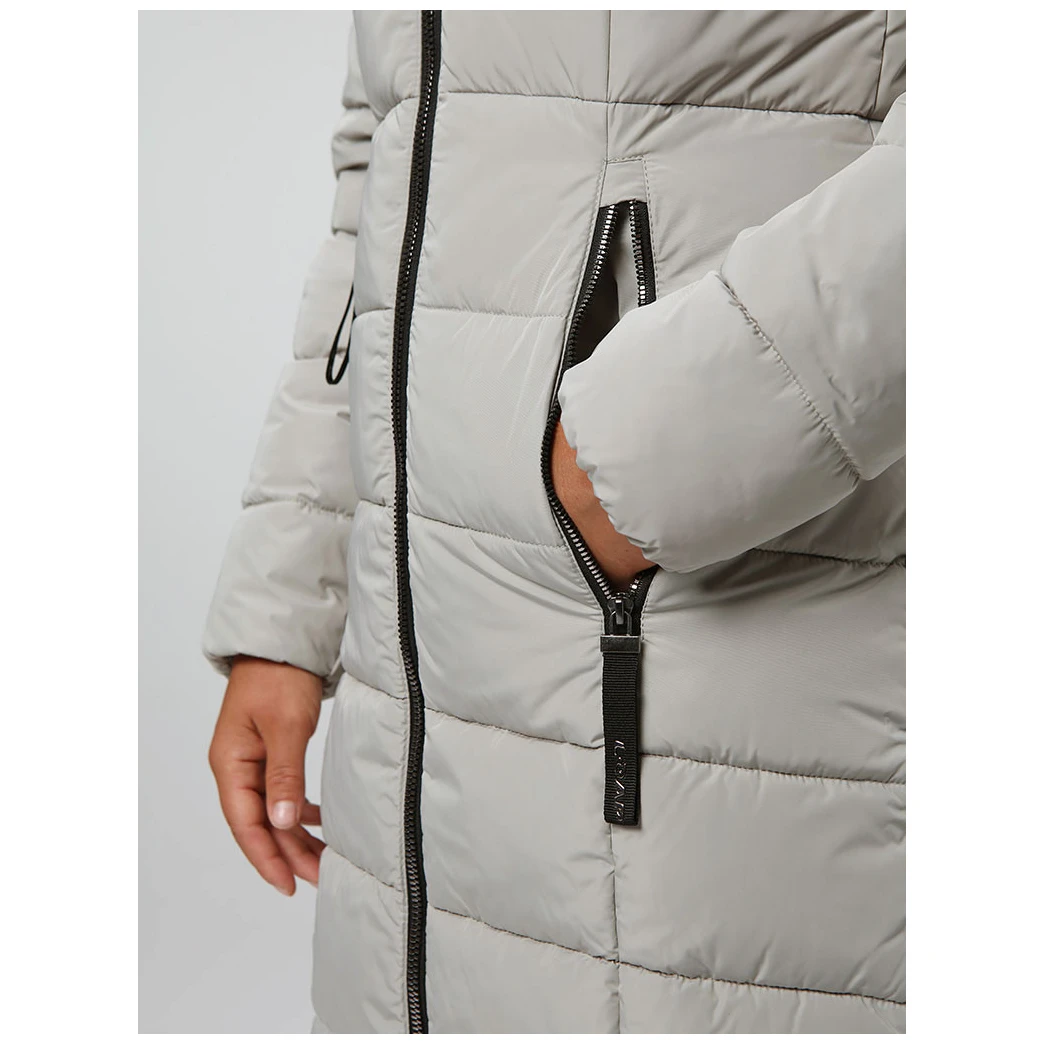 Entre las características prácticas del abrigo se incluyen una cremallera ósea bidireccional que permite abrirla fácilmente por ambos lados, y una capucha con pelo desmontable que añade estilo y proporciona protección adicional. Las mangas con cordón elástico interior y los dos amplios bolsillos con cremallera garantizan la funcionalidad y la comodidad, ya sea de camino al trabajo o en una salida invernal.