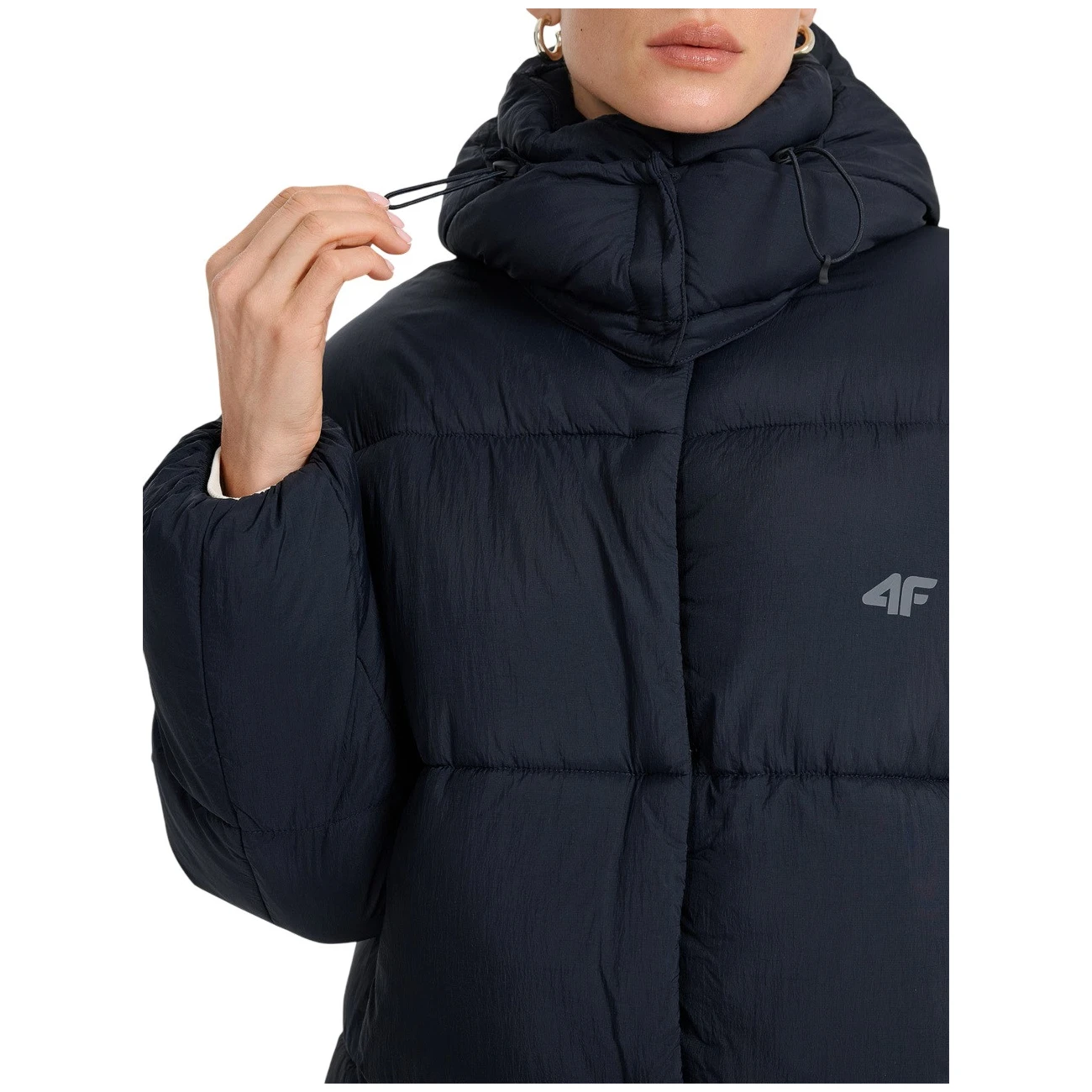 El abrigo de mujer Down Jacket F588 4F con corte oversize y largo hasta la rodilla, relleno sintético y tratamiento hidrófugo proporciona estilo, calidez y protección contra la humedad.