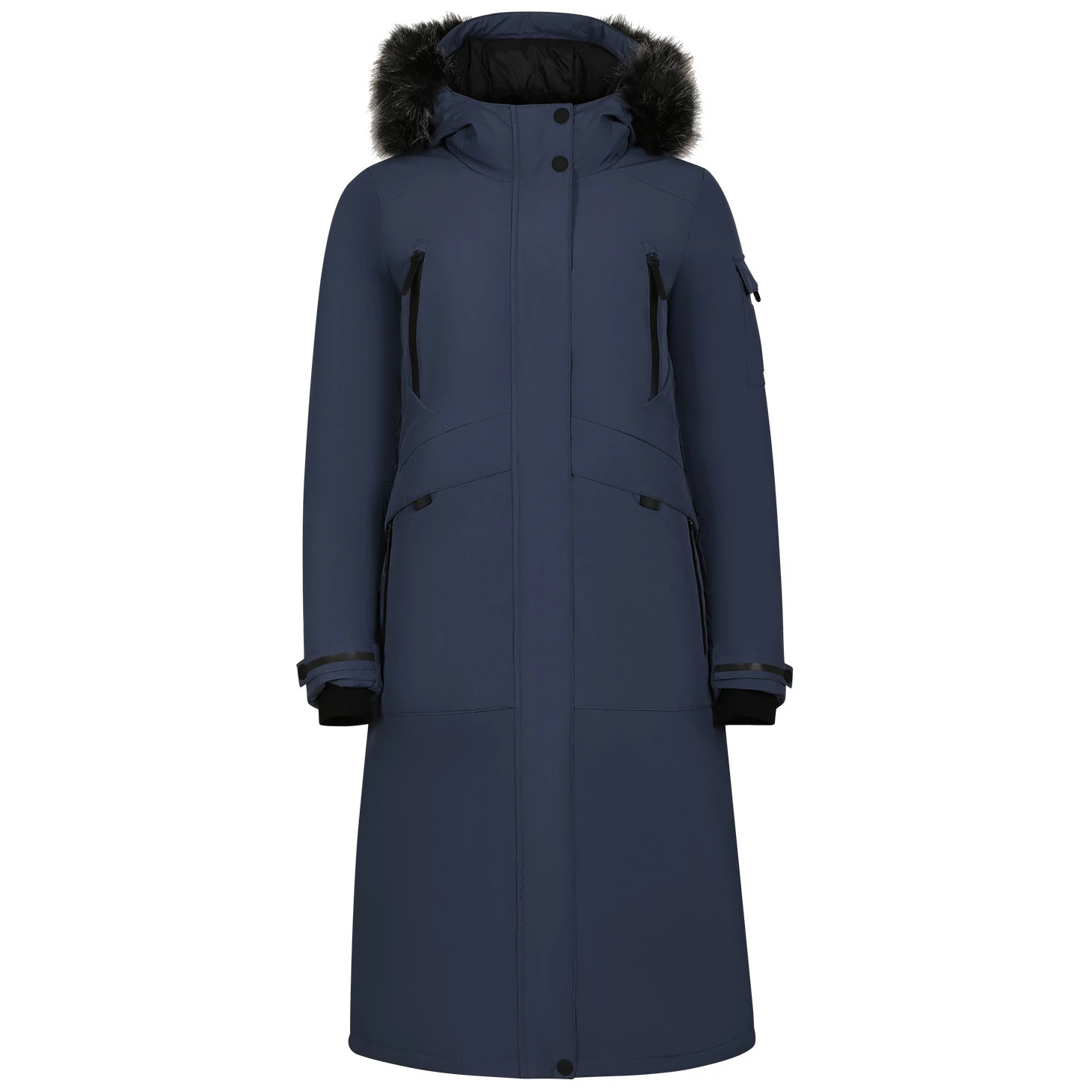 El tejido impermeable, transpirable, resistente al viento y elástico, junto con el grueso relleno cálido y el forro acolchado, mantiene el cuerpo caliente incluso a bajas temperaturas. El corte semiajustado realza la silueta femenina y, al mismo tiempo, garantiza la libertad de movimiento. La capucha fija con piel desmontable añade un toque de estilo al abrigo y, junto con el cálido cuello interior, protege la cara y el cuello del frío.