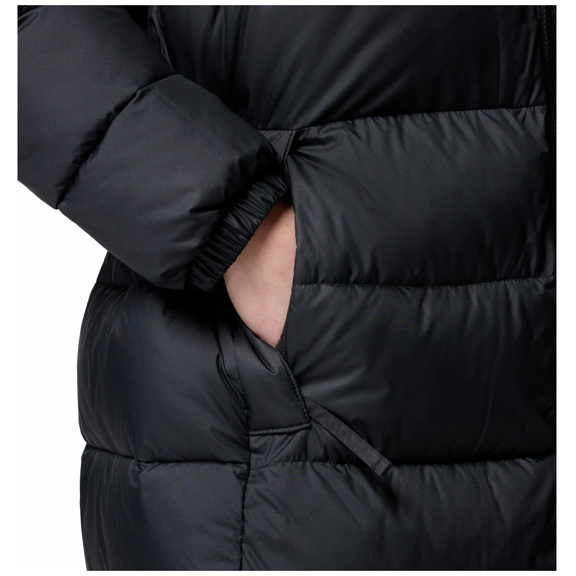 El abrigo cuenta con una capucha ajustable con protección para la barbilla, un cordón en la cintura para un ajuste ideal y broches laterales para mayor flexibilidad. Los prácticos bolsillos con cremallera para las manos y el bolsillo interior de seguridad garantizan un almacenamiento cómodo y seguro de los objetos pequeños, mientras que los puños elásticos mantienen el calor en el interior.