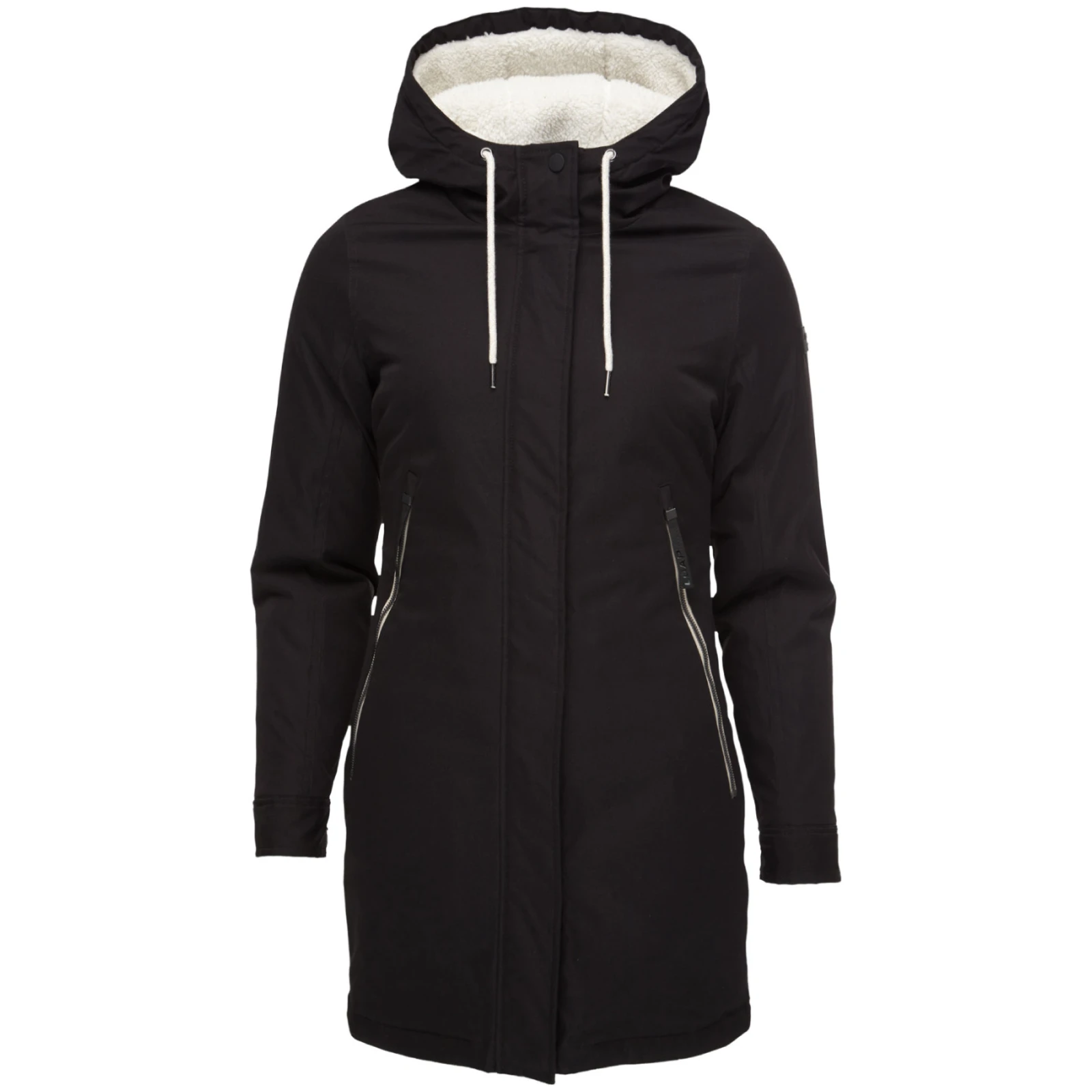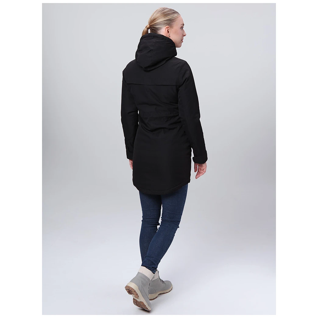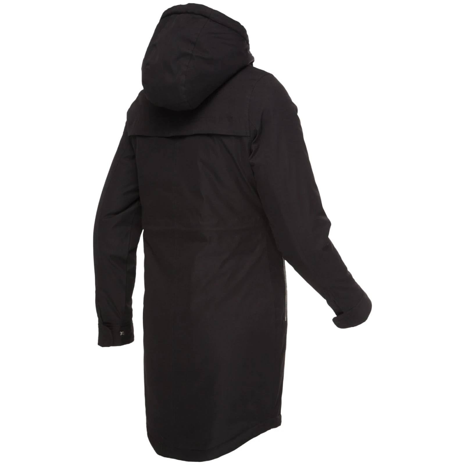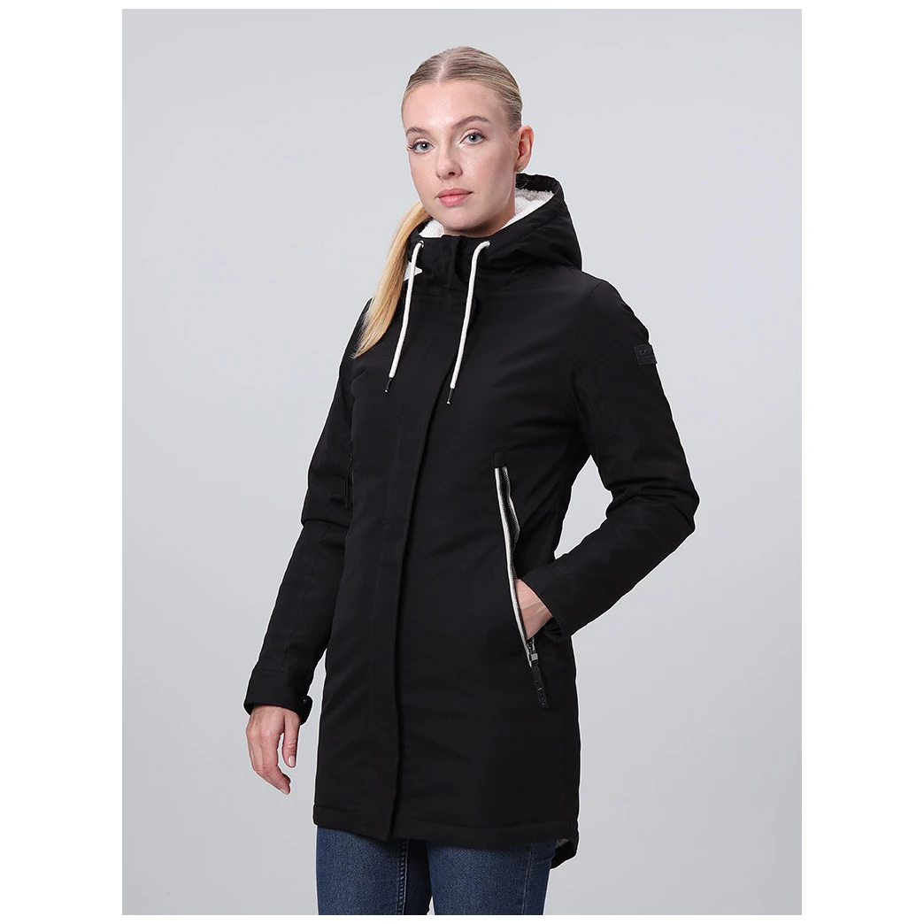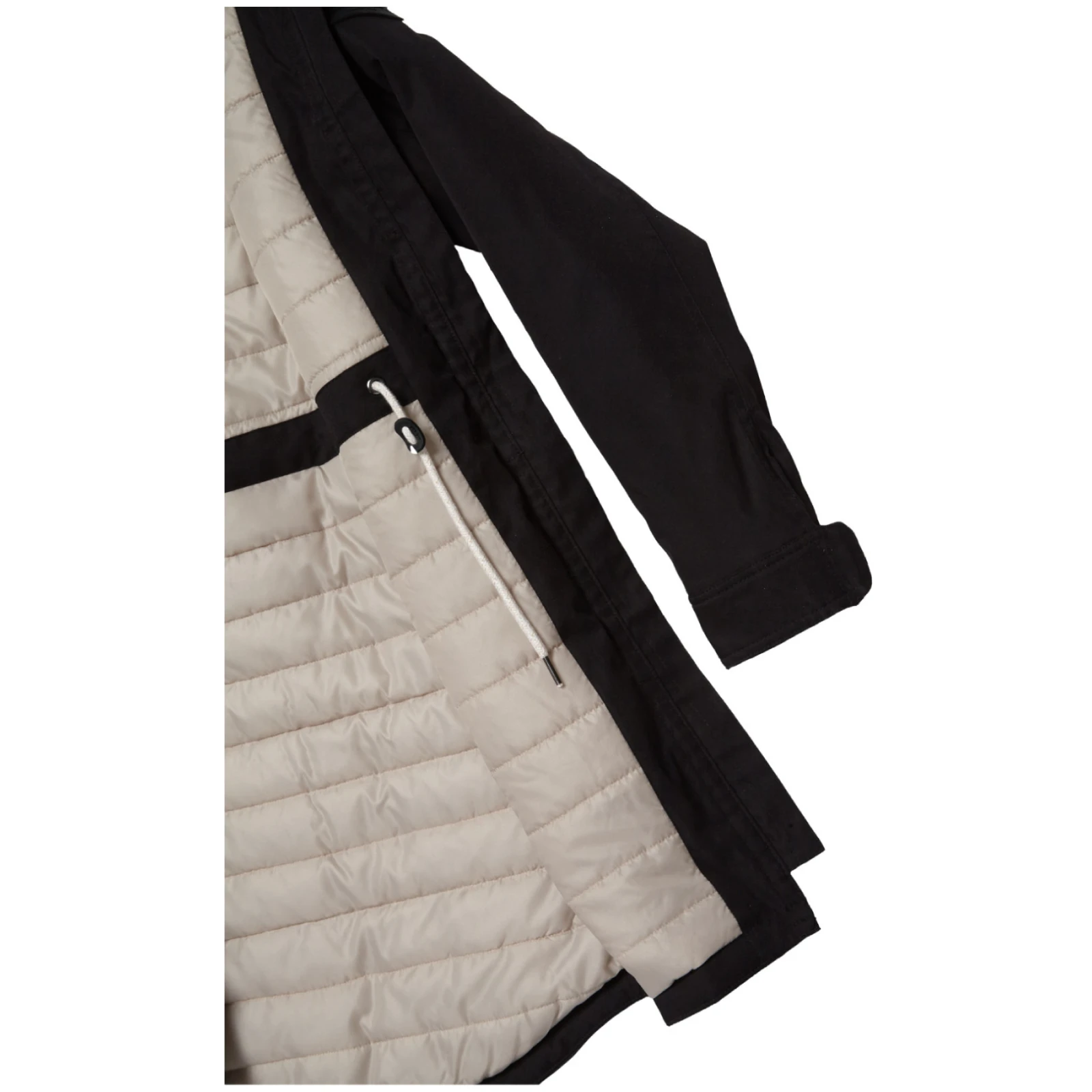El abrigo está diseñado con un corte clásico, cintura con cordón y capucha fija ajustable. Las mangas están provistas de botones y el dobladillo inferior no tiene cordón. La cremallera ósea bidireccional con efecto metálico no sólo añade atractivo, sino que permite abrir la cremallera por ambos lados. Dos prácticos bolsillos con cremallera sirven para guardar pequeños objetos.