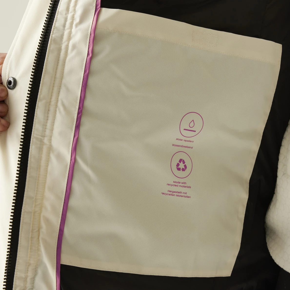 Los detalles funcionales, como la cremallera central de doble sentido, el cuello y los puños acanalados, o el cordón decorativo, realzan la calidad y la practicidad del abrigo. También cuenta con dos grandes bolsillos inferiores con doble entrada, tanto para las manos como con cremallera, y dos bolsillos interiores de seguridad para objetos pequeños. Todo el modelo está fabricado con materiales reciclados, lo que favorece un enfoque más sostenible de la moda.