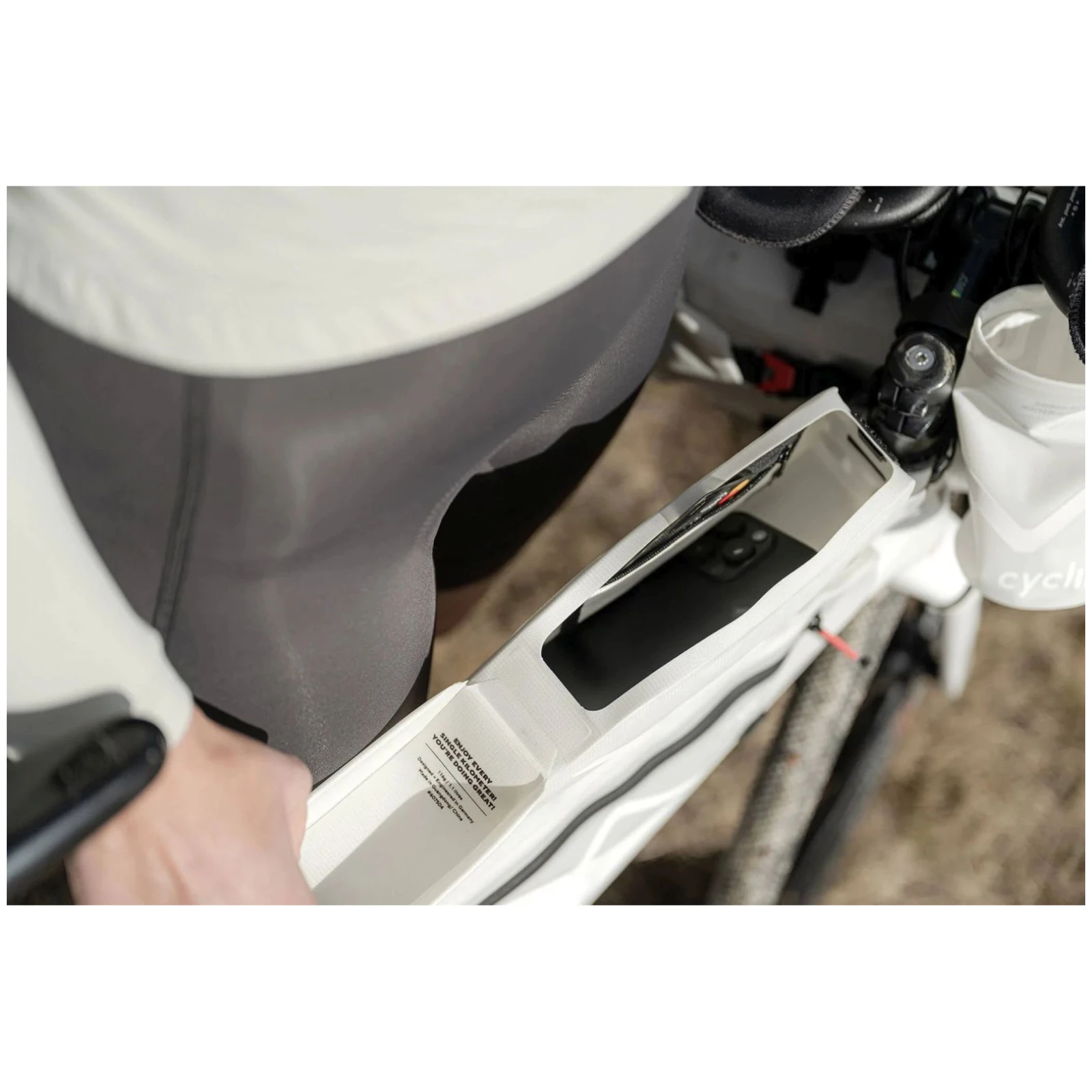 Cyclite Bolsa para el tubo superior es un bolso práctico para el tubo superior del cuadro que te permite tener tus objetos importantes siempre a mano. Es ideal para llevar barritas energéticas, geles, el teléfono o herramientas pequeñas durante la práctica de ciclismo de carretera o gravel.