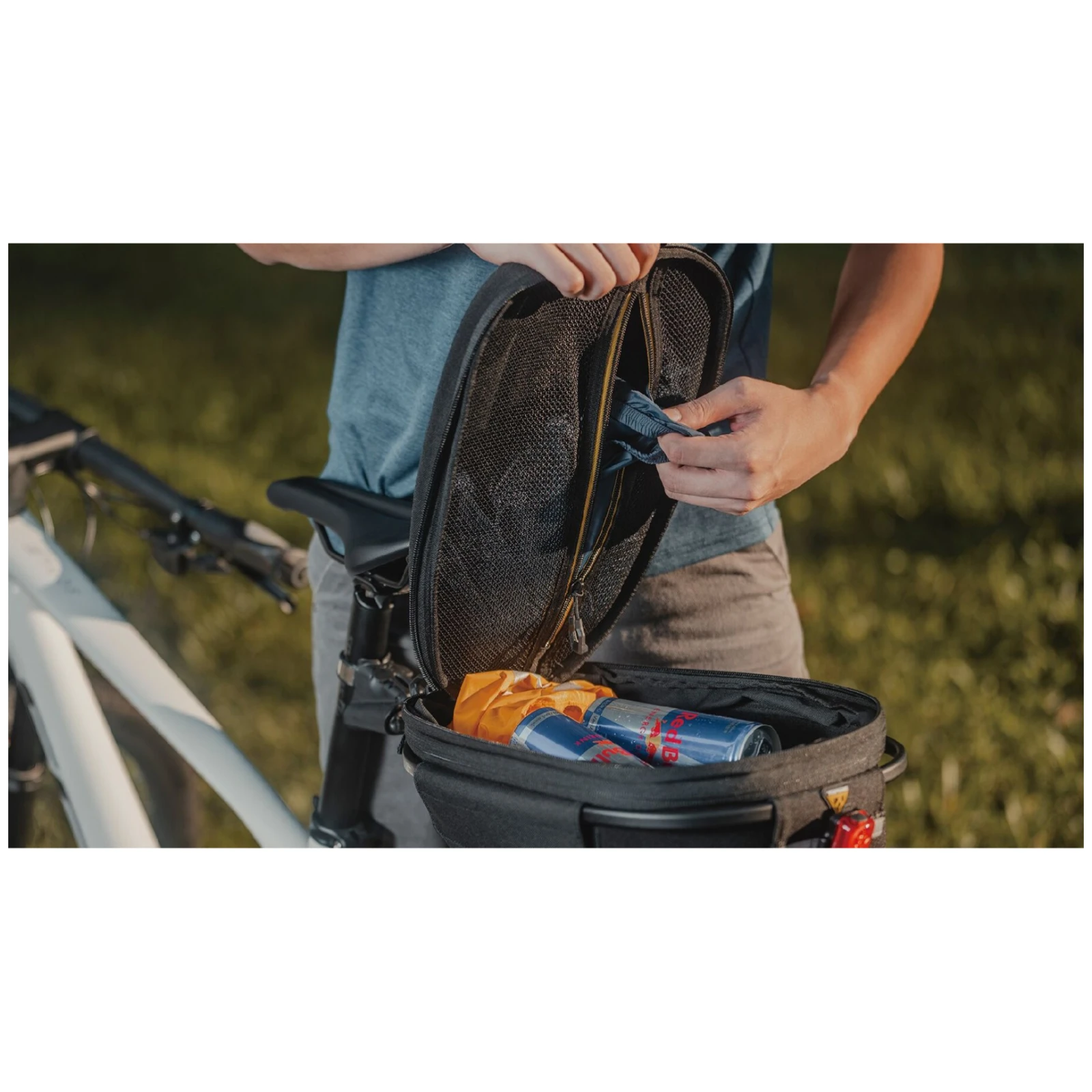 El bolsillo principal es lo suficientemente grande como para guardar herramientas, una cámara de repuesto, una cámara o necesidades para un picnic. El volumen total de la bolsa es de 9,7 l. El bolso está hecho de material 600 Denier y espuma EVA, para una mayor seguridad también está equipado con una banda reflectante 3M y un bucle para sujetar luces RedLite™.