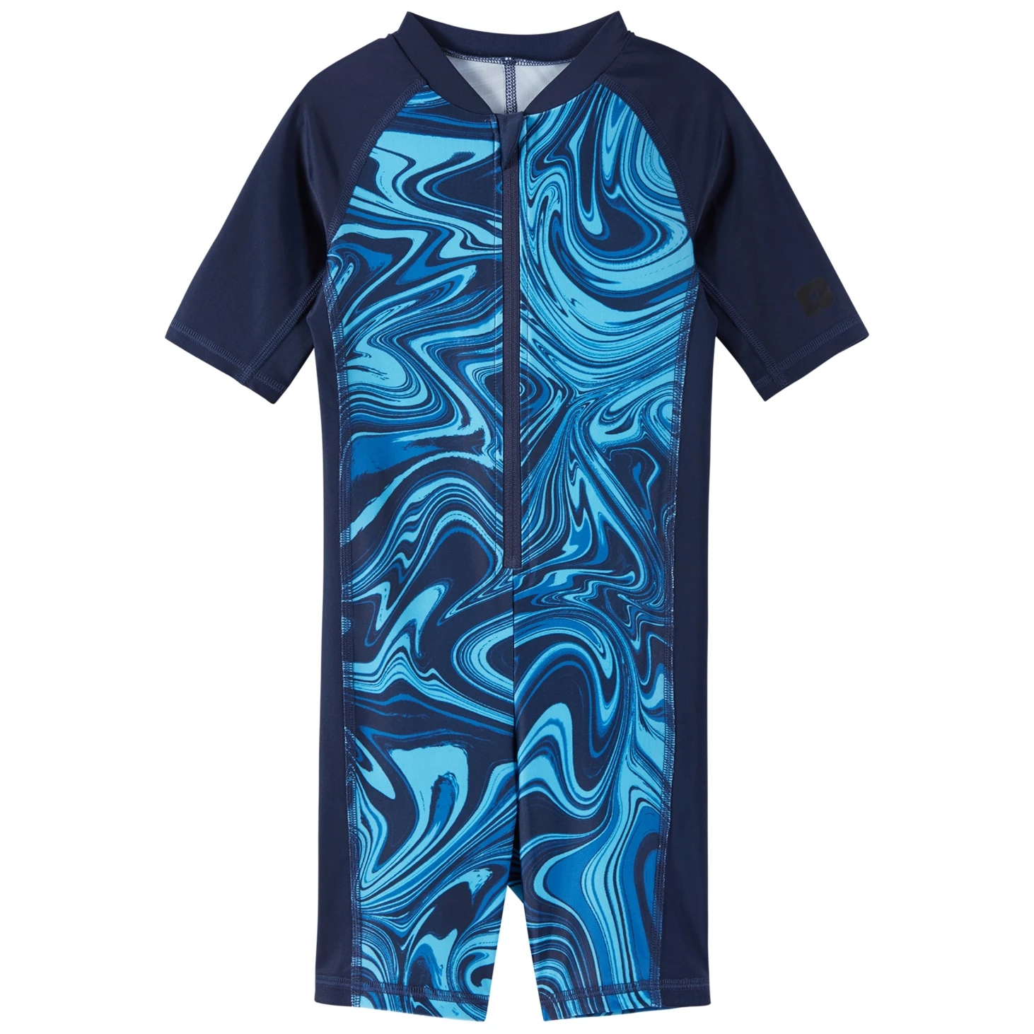 El traje de baño infantil Vesihiisi de la colección Reima SunProof fue diseñado para interminables juegos en el agua y en la playa. El mono está fabricado en fibra con factor de protección UV 50+, que proporciona una protección eficaz contra el componente nocivo de la luz solar. El mono protege hasta los codos y las rodillas. El material elástico se seca rápidamente y la cremallera frontal facilita su colocación.