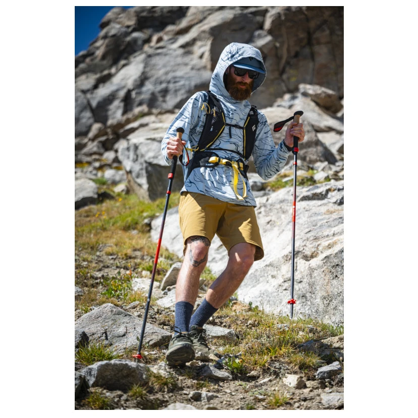 La construcción 100% de carbono garantiza alta rigidez y bajo peso, mientras que el sistema de plegado de tres piezas permite un despliegue y plegado rápidos. El ajuste de longitud mediante el sistema FlickLock+ proporciona un ajuste rápido y seguro según el terreno actual. El mayor diámetro de los segmentos aumenta la resistencia y la estabilidad bajo carga.