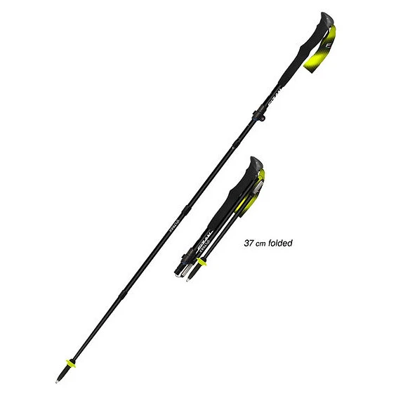 El mango ergonómico está equipado con una extensión de espuma que mejora el agarre al cambiar la inclinación del terreno. El diseño técnico se complementa con un distintivo plato amarillo fluorescente que combina con la correa y da a los bastones un diseño moderno y funcional.