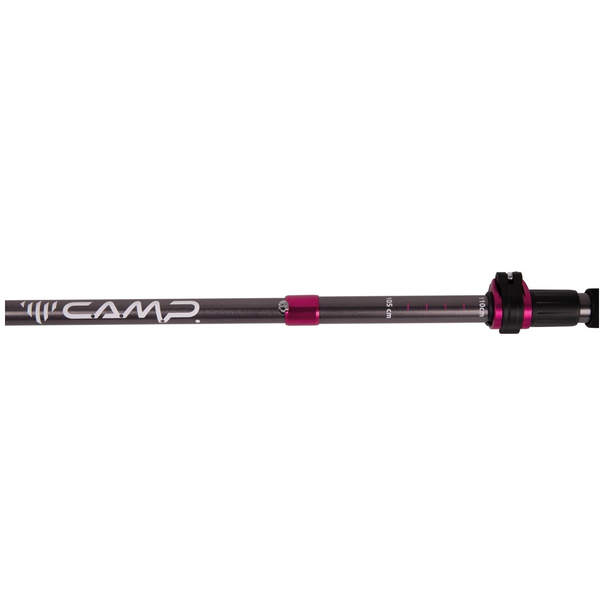 Las bastones de trekking plegables de aluminio para mujer Laser Ajustable W de la marca Camp están diseñados para las travesías más exigentes que requieren una combinación precisa de ligereza, rendimiento y fiabilidad. El cable de acero inoxidable recubierto de poliamida y los uniones segmentadas moldeadas facilitan y agilizan el montaje. El segmento superior está equipado con un sistema de bloqueo rápido y seguro para un ajuste de 105 a 125 cm. Las empuñaduras ergonómicas de espuma de doble longitud están diseñadas para ofrecer un buen agarre en cualquier posición, y las correas ergonómicas para la muñeca están hechas de material suave para una comodidad excepcional. Puntas de carburo para la máxima tracción y durabilidad.