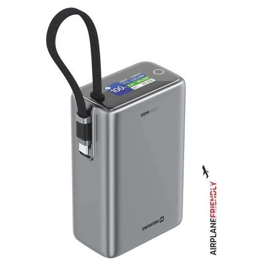 Powerbanka Swissten de 25 000 mAh (96,25 Wh) es el compañero ideal para viajeros frecuentes y para uso diario. Gracias a su capacidad justo por debajo del límite para transporte a bordo (100 Wh), puedes llevarla también en el avión. La powerbanka puede cargar un portátil, una tablet y un smartphone simultáneamente, y proporciona una potencia máxima de hasta 100 W.