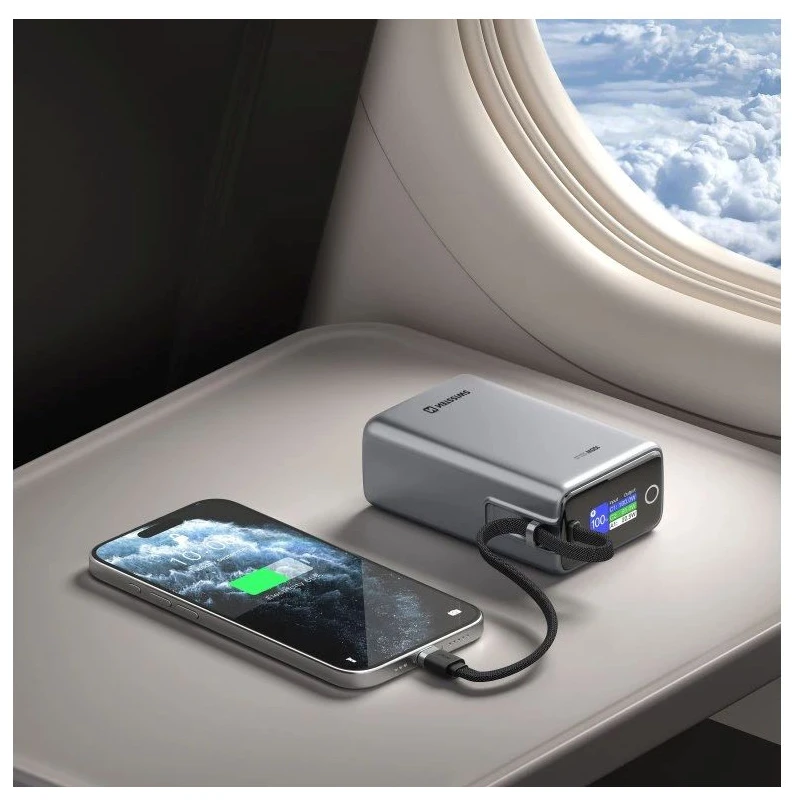 El cable USB-C integrado de 25 cm está siempre a mano y la pantalla digital permite monitorizar con precisión la capacidad restante y la potencia de entrada y salida actual. La robusta construcción de policarbonato y ABS es ignífuga y segura.
