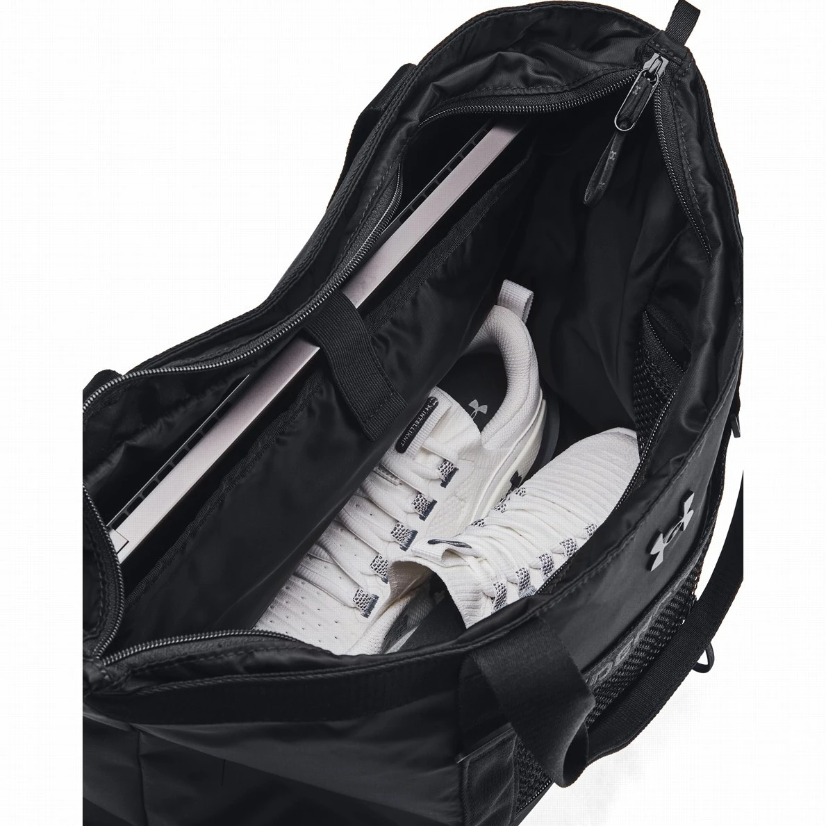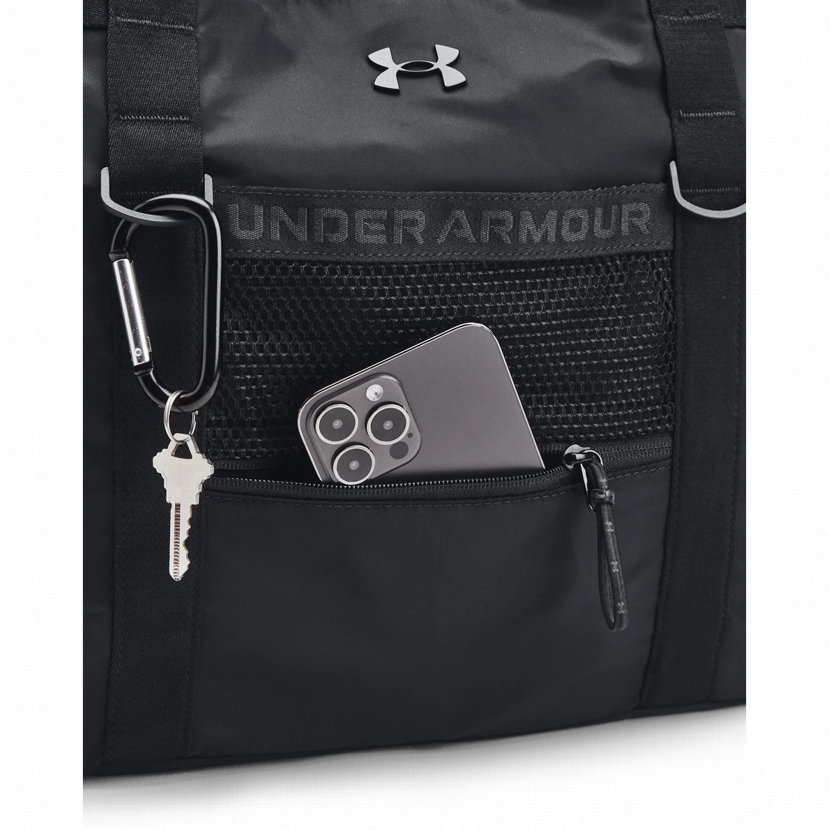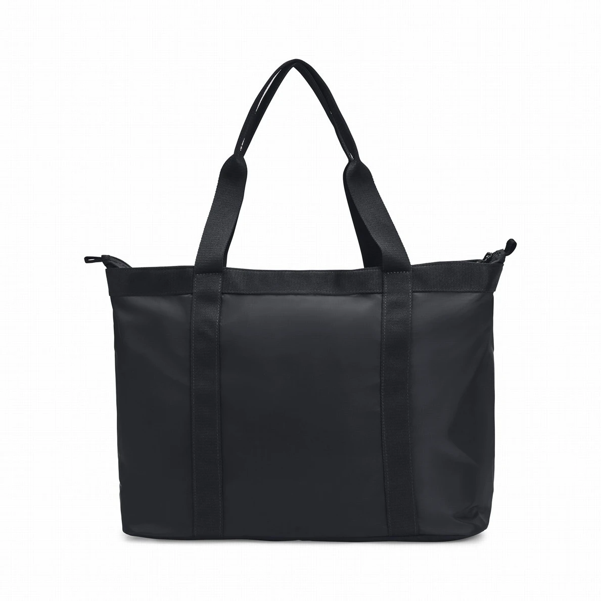 Bolso tote Studio para mujer de Under Armour con un gran compartimento principal con cremallera con organización interna y un compartimento para computadora portátil o tableta con forro suave: tiene capacidad para una MacBook Pro® o computadora portátil de hasta 16".Puntos de fijación con anillos en D para sujetar fácilmente cualquier bolso con un mosquetón. Cremallera equipada con una banda elástica que se puede utilizar, por ejemplo, en el pelo.