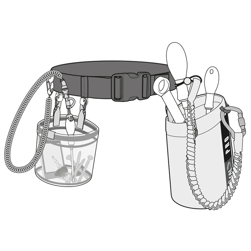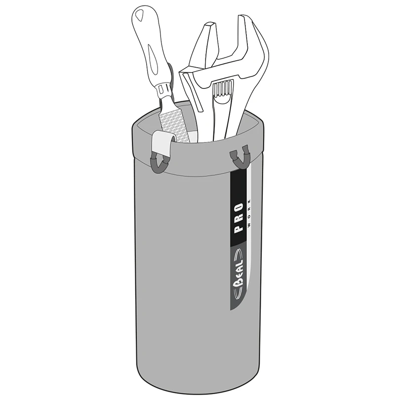 El cubo para herramientas largo, con una capacidad de 5 l, es adecuado para herramientas pequeñas para trabajos en altura. El sencillo sistema de cierre Clic-Clac sirve para evitar la pérdida del contenido durante el transporte. Dos pequeños ojales exteriores para fijar el Beal Air-Leash (cinta elástica de seguridad) para asegurar la herramienta contra caídas. Gracias a dos pequeños mosquetones, la bolsa puede fijarse a un arnés o a un asiento de trabajo.