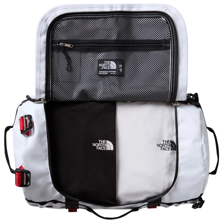 La bolsa de viaje Base Camp Duffel de gran durabilidad de la empresa estadounidense The North Face en tamaño S y con volumen de 50 litros tiene un corte optimizado de correas de hombro para un transporte más cómodo. Los agarraderos son cómodos y no aprietan. Está fabricado de material impermeable y resistente a la abrasión. La nueva bolsa incorpora una cremallera lateral, un bolsillo para el móvil, la cartera u otros objetos pequeños que necesita tener a mano rápidamente.