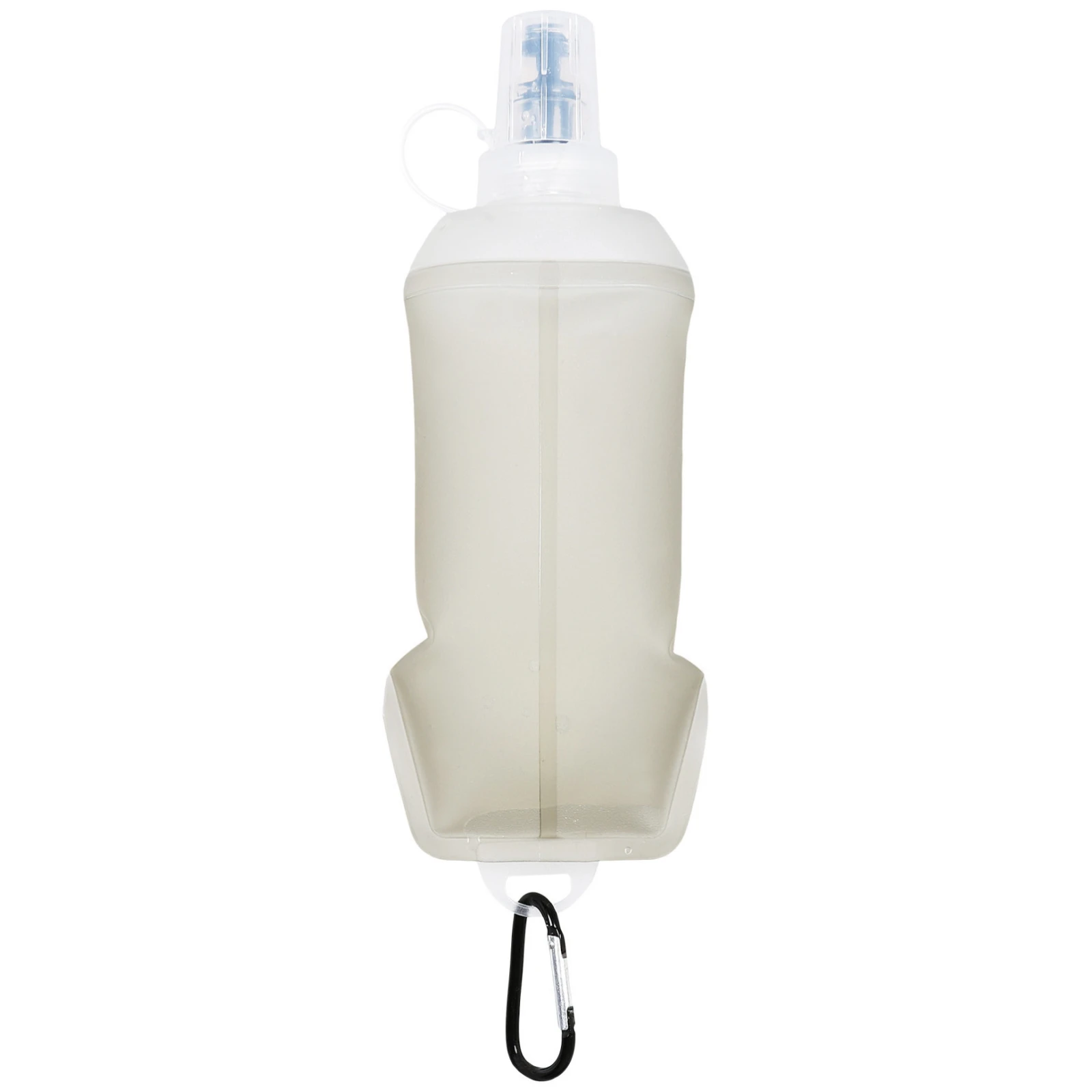 La botella está fabricada en material 100% TPU, que es flexible, duradero y además libre de BPA, por lo que es apto para uso regular. Una vez vacía, se puede plegar fácilmente y ocupa un espacio mínimo, lo que apreciarás durante movimientos prolongados o en espacios reducidos. Está equipada con una boquilla de mordida con un tapón de cierre que evita fugas de líquido no deseadas. Esto hace que beber sea rápido y cómodo, incluso en movimiento. También incluye un mosquetón desmontable que permite fijarla fácilmente a una mochila o equipo. Además, la botella es compatible con chalecos para correr, donde se puede guardar cómodamente en los bolsillos delanteros.