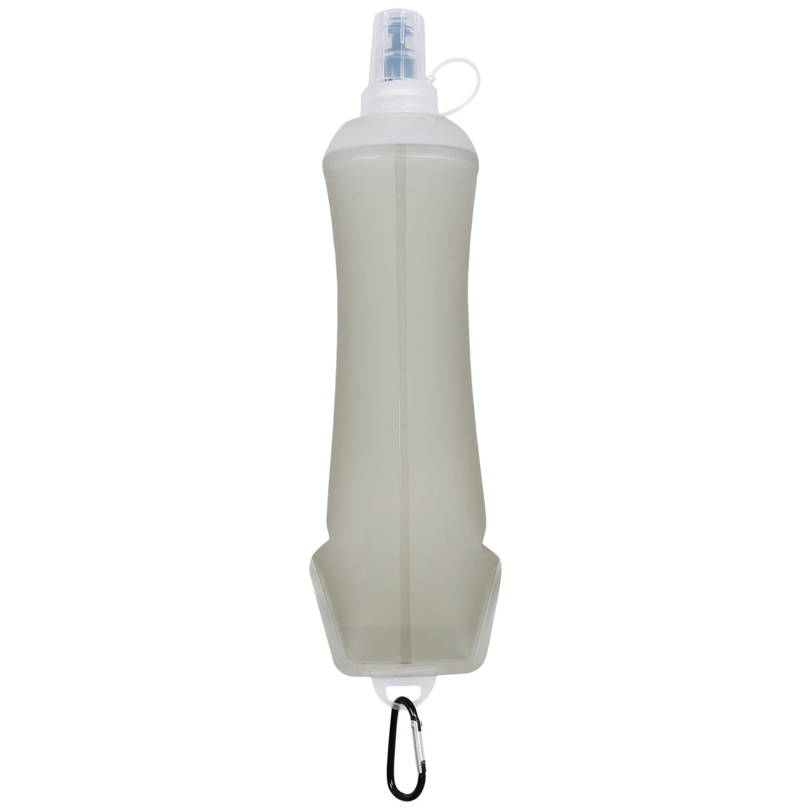 La botella está fabricada en material 100% TPU, que es flexible, duradero y además libre de BPA, por lo que es apto para uso regular. Una vez vacía, se puede plegar fácilmente y ocupa un espacio mínimo, lo que apreciarás durante movimientos prolongados o en espacios reducidos. Está equipada con una boquilla de mordida con un tapón de cierre que evita fugas de líquido no deseadas. Esto hace que beber sea rápido y cómodo, incluso en movimiento. También incluye un mosquetón desmontable que permite fijarla fácilmente a una mochila o equipo. Además, la botella es compatible con chalecos para correr, donde se puede guardar cómodamente en los bolsillos delanteros.