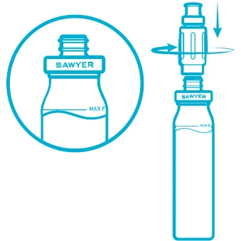 NOTA: Drecomendamos llenar y secar la botella solo a través de la abertura más pequeña a la que está conectado el filtro Sawyer. Si retira el tapón reductor, deberá volver a sellarlo antes de poder utilizar la botella de nuevo. De lo contrario, el agua sin filtrar puede filtrarse y contaminar el agua potable
