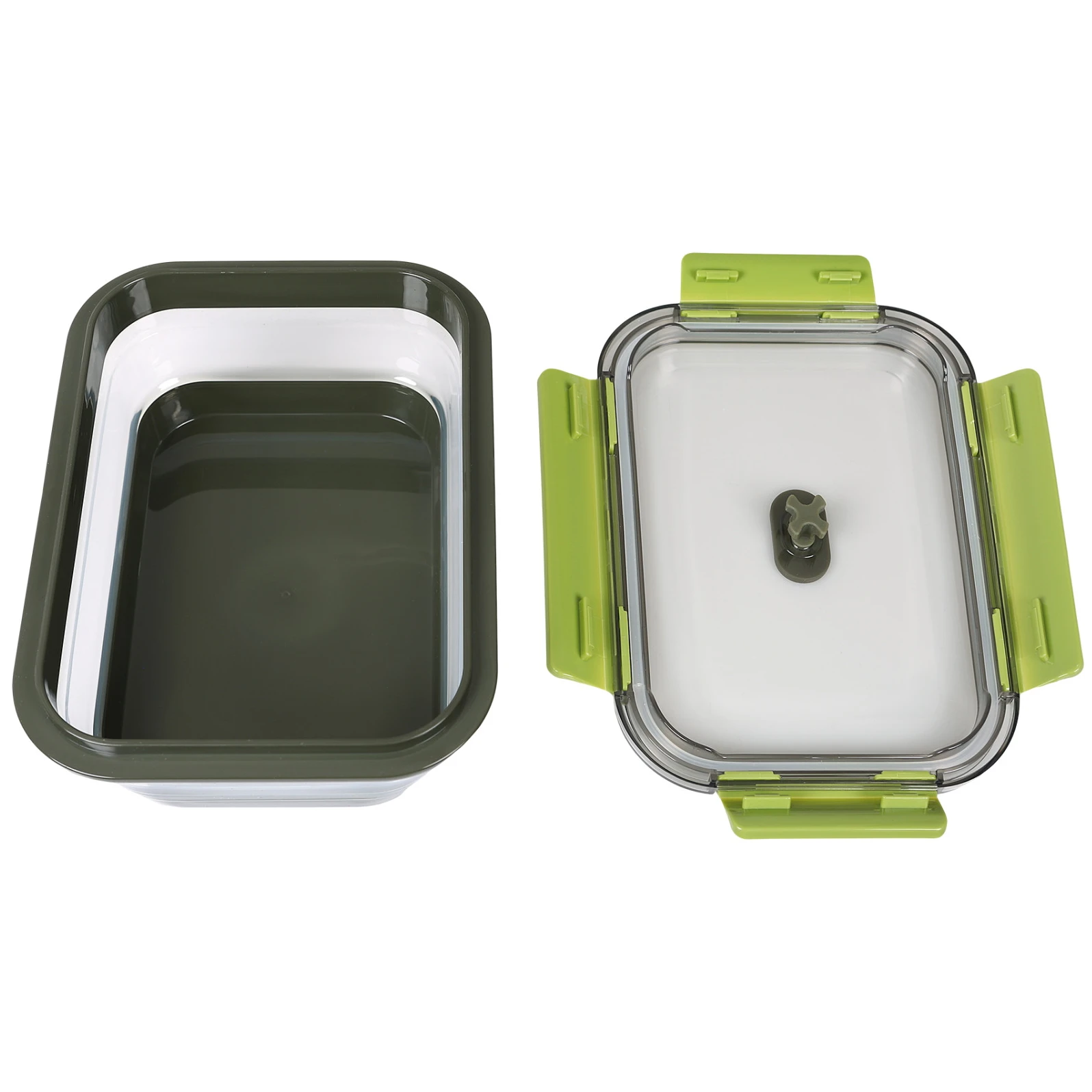 La tapa firme con cierre de cuatro puntos y el sello de silicona aseguran que el contenido permanezca seguro en el interior sin riesgo de derrame. El cuenco se puede lavar en el lavavajillas.