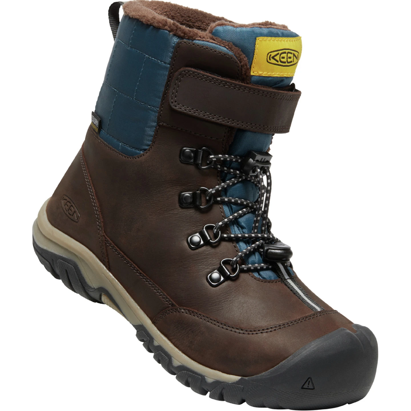 Bota urbana de invierno para niños Greta Boot Wp Niños con alta durabilidad y gran tracción. Los niños pueden sumergirse en toda la diversión de la nieve con los cálidos dedos de los pies gracias a los 200 g de aislamiento KEEN.WARM, que los mantiene cómodos hasta -32 °C durante todo el día. Las botas tienen una membrana KEEN.DRY impermeable y transpirable para mantenerte caliente y seco en los meses de invierno. La parte superior de cuero y textil duradero es un material repelente al agua sin PFC. Piel premium tratada ecológicamente. Correa de velcro ajustable. Eco Antiolor para eliminar los malos olores. También tienen una suela de goma para una mejor tracción y una plantilla Thermal Heat Shield que atrapa el calor y mantiene los pies de los niños en perfecto confort térmico.