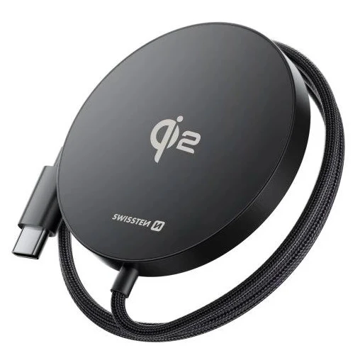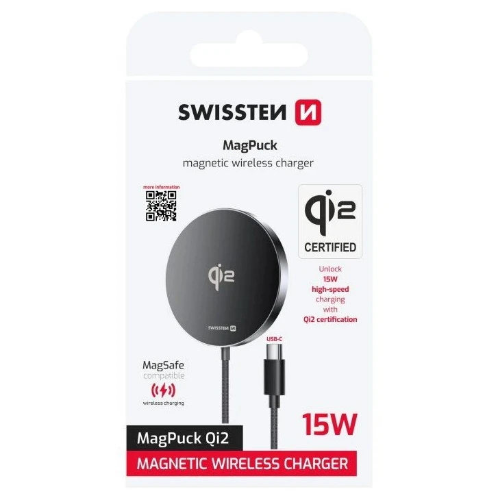 Cargador inalámbrico moderno Swissten MagPuck con soporte Qi2 que ofrece carga rápida, segura y elegante para iPhone, Samsung y otros dispositivos compatibles.