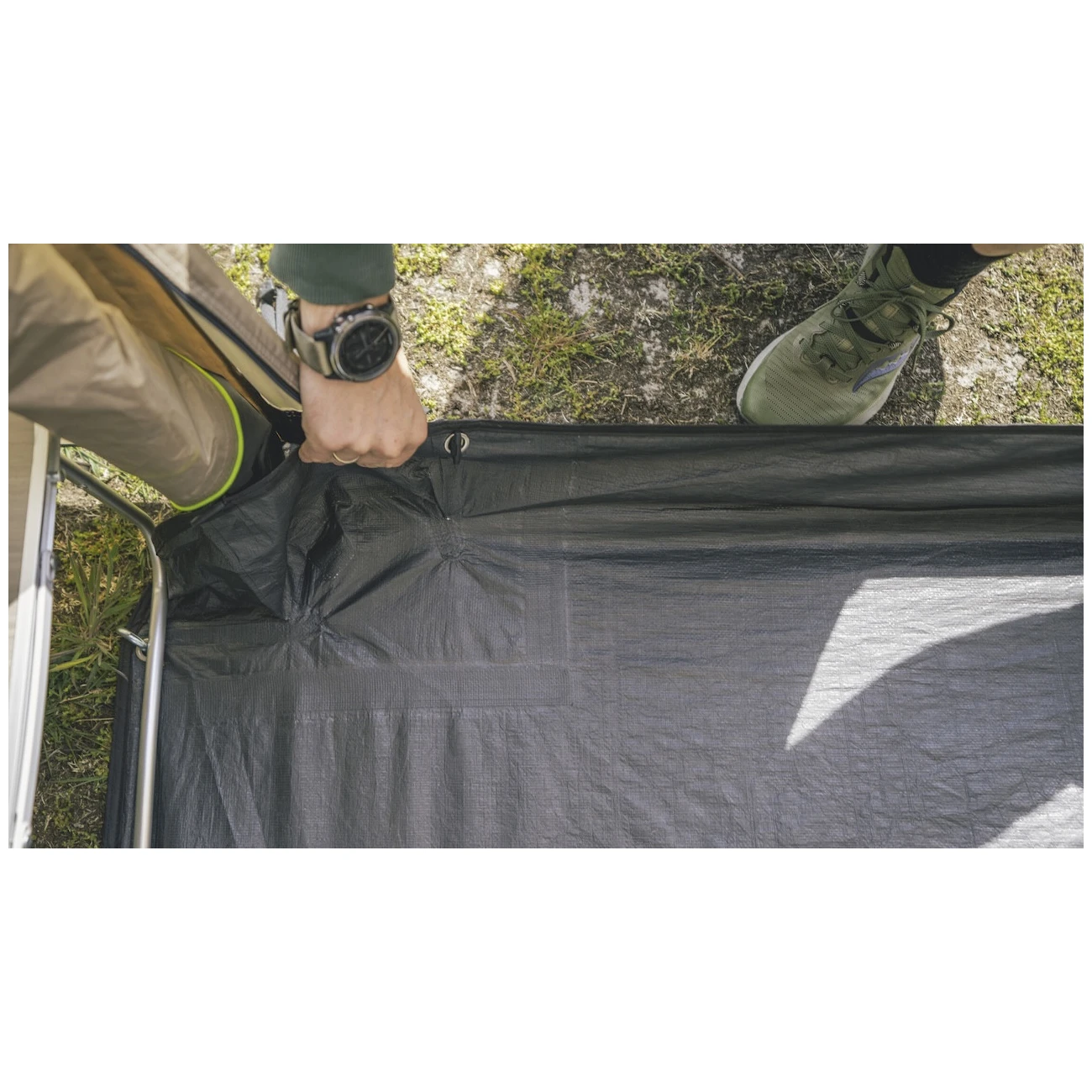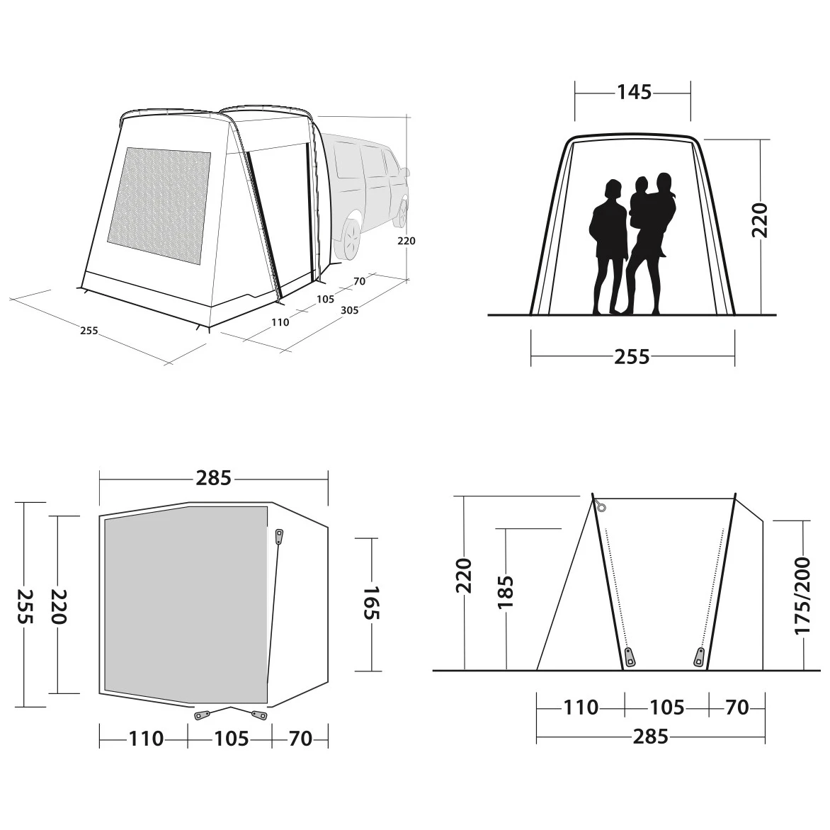 Para fijar la tienda al coche, se suministran raíles de cedro de 5 mm y 7 mm de ancho, de modo que se adapta a la anchura de los raíles. La tienda tiene altura ajustable entre 175 - 205 cm. El resistente sistema de fijación con velcro sujeta eficazmente la lona y las varillas y ancla la tienda al suelo con cuerdas y estacas, por lo que puede soportar el tiempo ventoso sin problemas. Las cuerdas están prácticamente enroscadas en la lona para que no se enreden durante el embalaje.