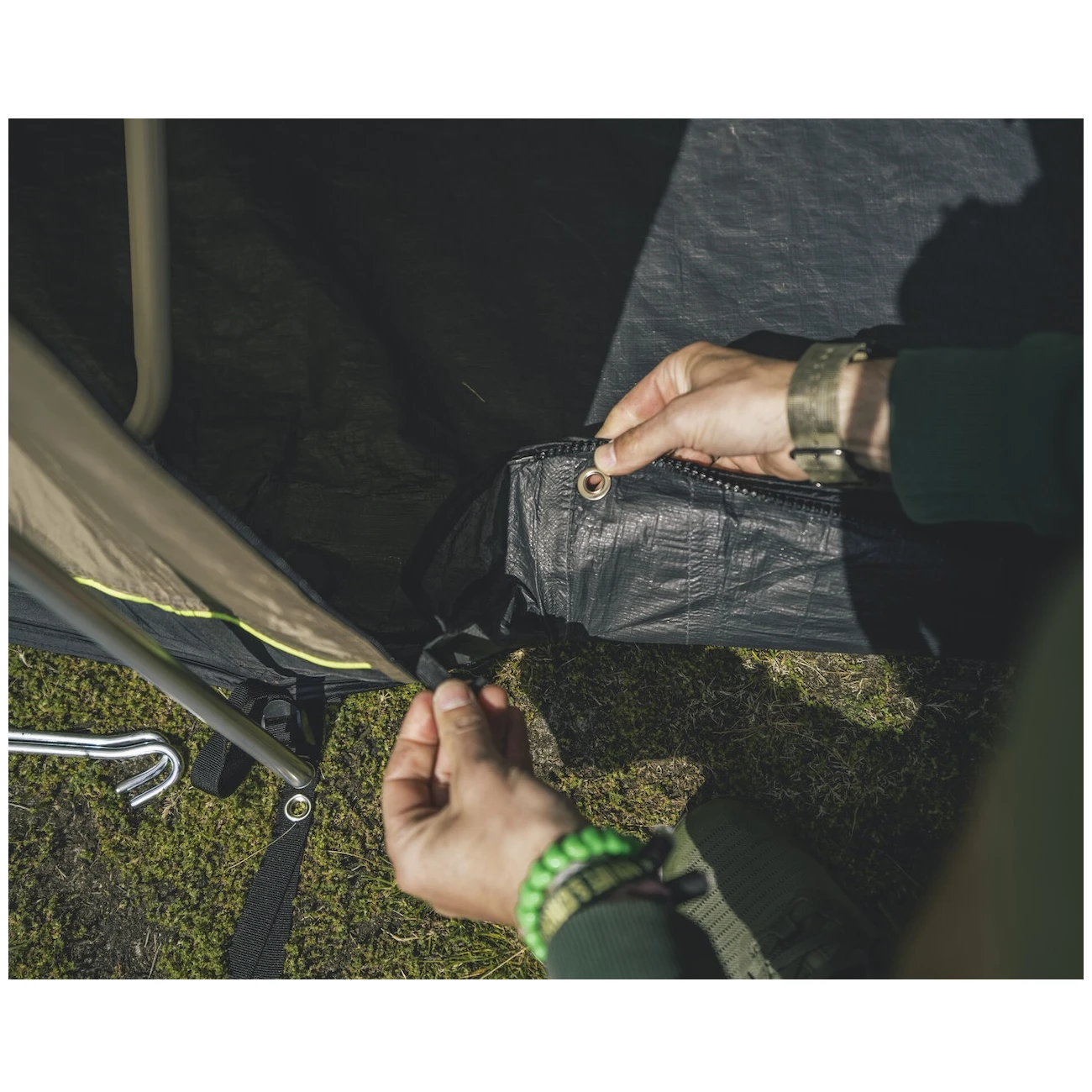 El refugio cuenta con numerosas características prácticas, incluyendo un sistema de suspensión HookTrack, que permite colgar objetos ligeros (capacidad de carga de 1,5 kg) en la estructura preparada. Para mayor comodidad, la tienda se puede complementar con una alfombra originalo una esterilla, que protegerá el suelo de la suciedad y los daños causados por la parte inferior.