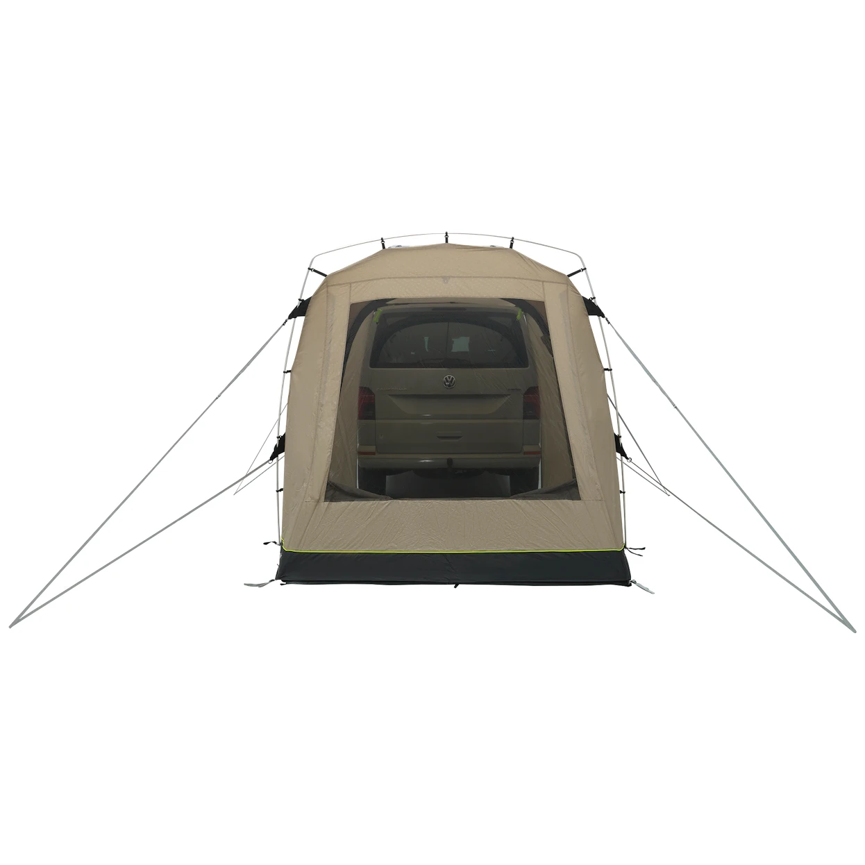 La tienda de campaña dispone de una gran entrada sin barreras con mosquitera, que también puede utilizarse como refugio (los postes no están incluidos). Los paneles plegables en los laterales del vehículo proporcionan acceso protegido al interior. La gran ventana tintada deja entrar mucha luz, pero también proporciona protección contra la radiación UV y privacidad. Se puede cerrar con una cortina. Las puertas traseras del vehículo se pueden abrir hacia dentro, mientras que el sistema de fijación no bloquea las puertas laterales.