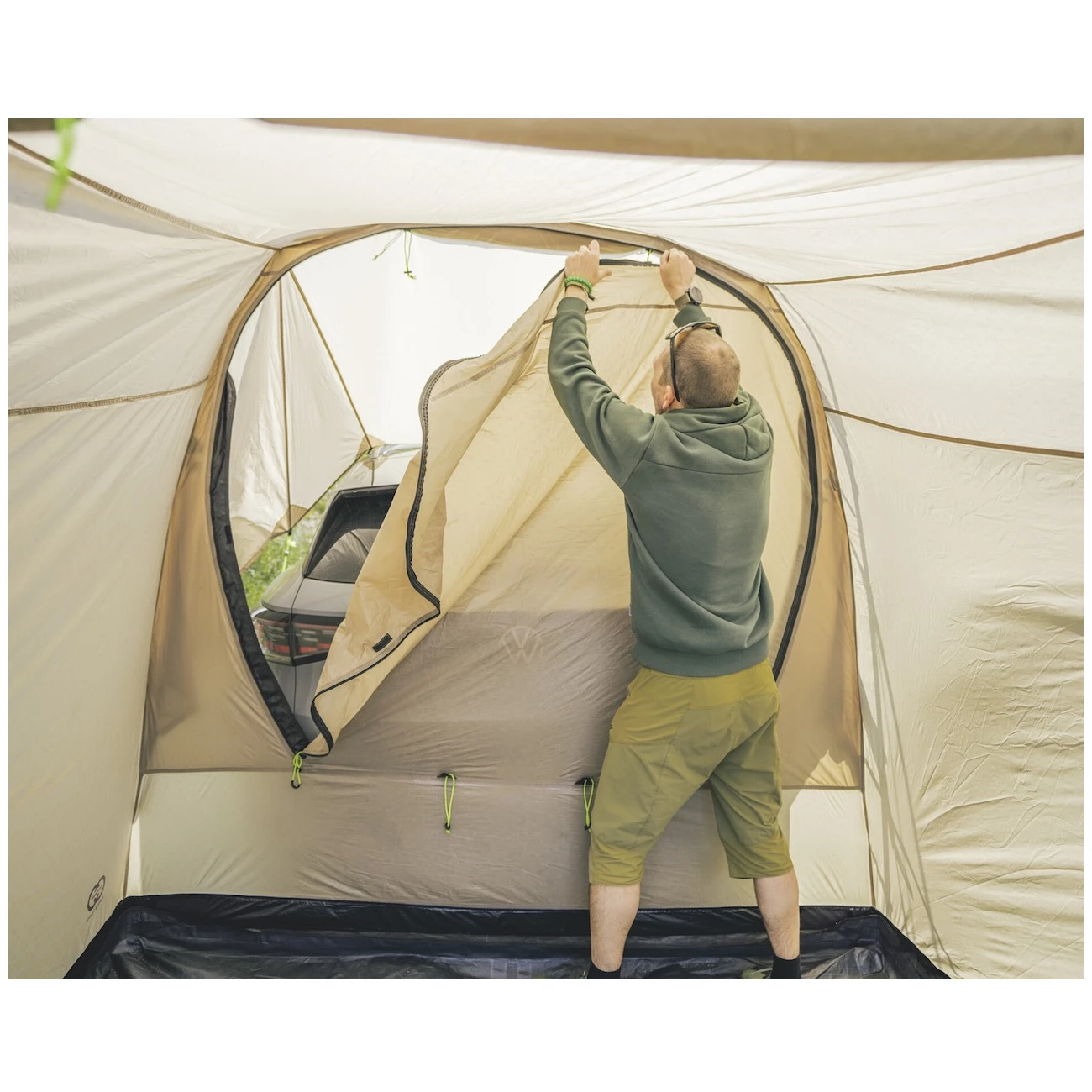 La tienda de campaña dispone de una gran entrada sin barreras con mosquitera, que también puede utilizarse como refugio (los postes no están incluidos). Los paneles plegables en los laterales del vehículo proporcionan acceso protegido al interior. La gran ventana tintada deja entrar mucha luz, pero también proporciona protección contra la radiación UV y privacidad. Se puede cerrar con una cortina. Las puertas traseras del vehículo se pueden abrir hacia dentro, mientras que el sistema de fijación no bloquea las puertas laterales.