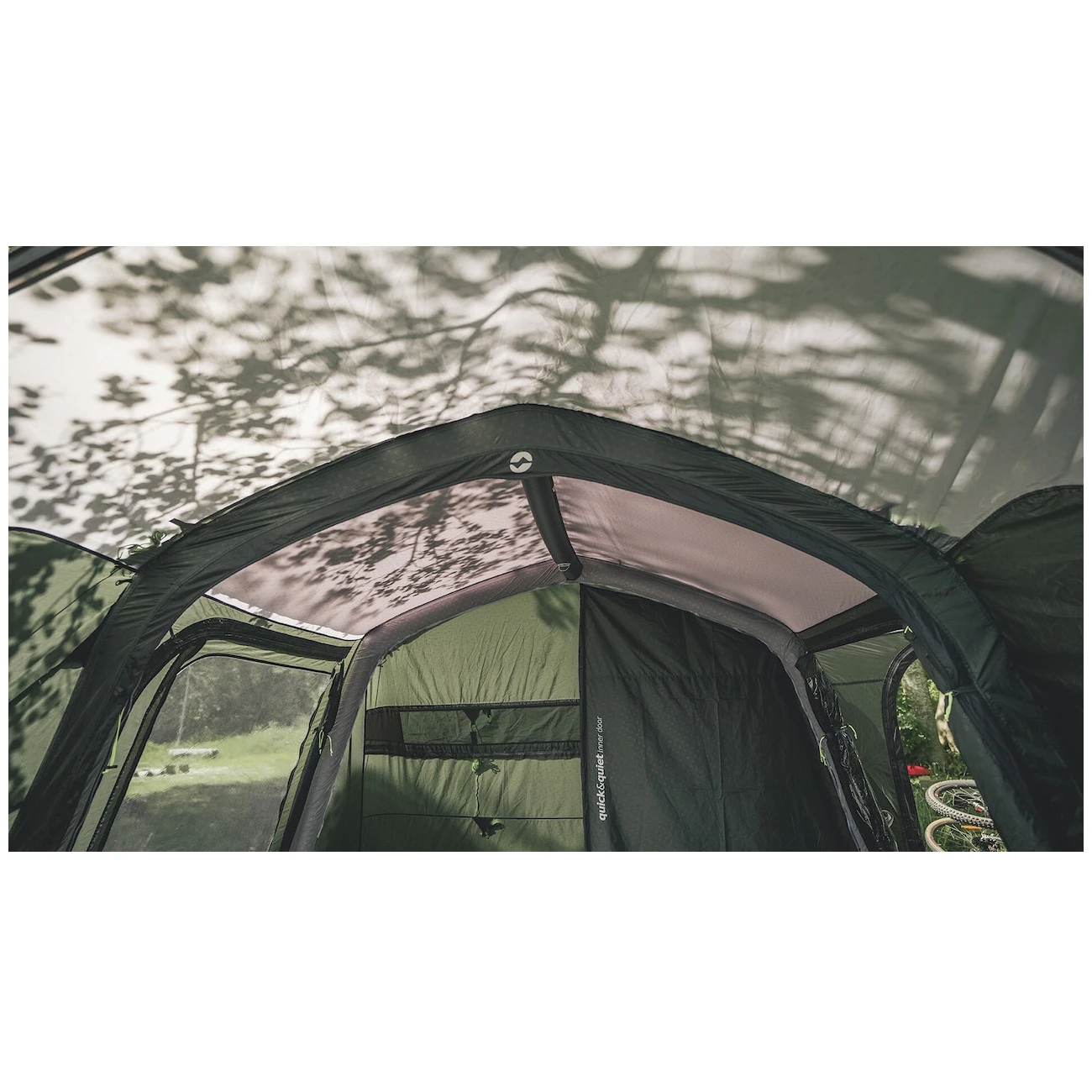 Estructura inflable Power Air System compuesta por cámaras de aire separadas preformadas. Estas aseguran la estabilidad de la tienda junto con las varillas de soporte de fibra de vidrio, acero, estacas y cuerdas. Las clavijas están codificadas por colores para que quede claro de un vistazo cuál va dónde para cumplir la función ideal. Las cuerdas siempre están bien recogidas en la lona exterior, lo que resulta muy práctico porque no se enredan durante el embalaje. Forma aerodinámica Aerodinámica Storm Protection 10 proporciona protección contra vientos de hasta 102 km/h.