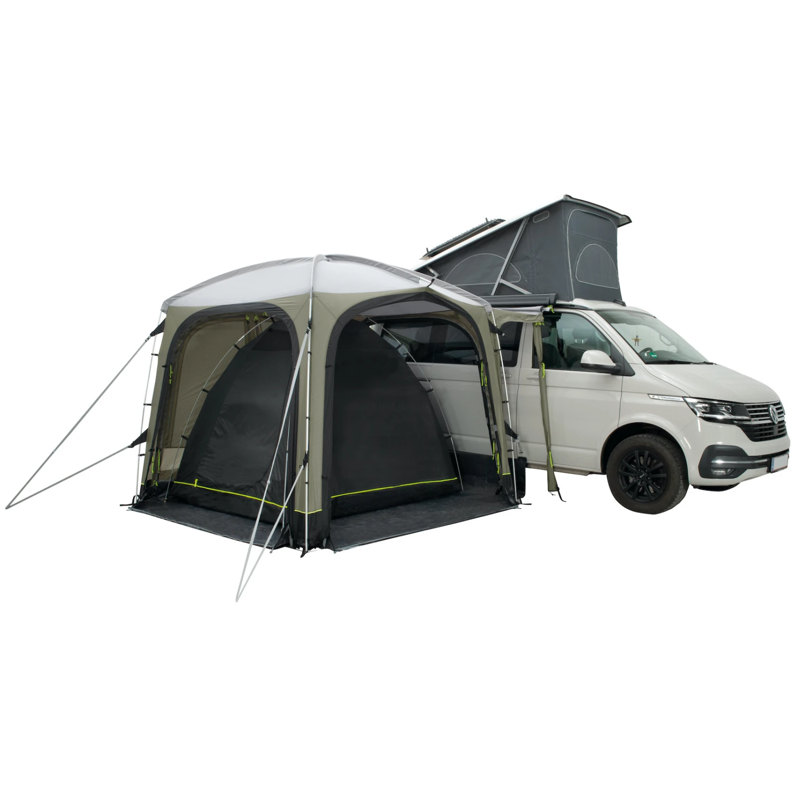 La tienda delantera también puede presumir de entradas cubiertas para cables de extensión de red que permiten enchufar una lámpara o cargar un teléfono móvil, cremalleras pegadas, la posibilidad de abrir el maletero desde el coche con una tienda delantera adjunta, un sistema de protección contra el viento OWS System Force 10 o correas para tormentas Storm Guyline. También apreciará el sistema Hooktrack, que permite fijar objetos ligeros, cables y lámparas a "raíles" preparados previamente (capacidad de carga de hasta 1,5 kg).