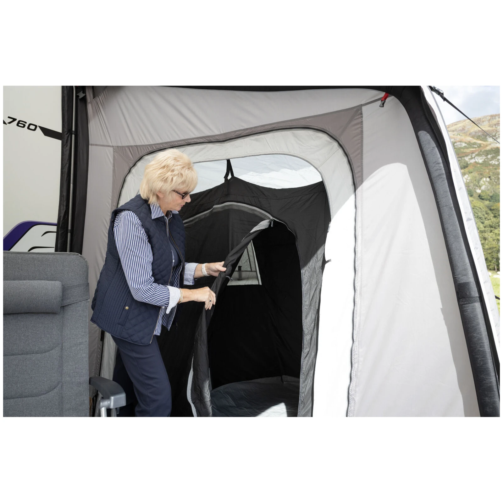 Las grandes panorámicas ventanas Diamond Clear garantizan una excelente vista del entorno y abundante luz diurna, mientras que las cortinas con cremallera permiten una fácil regulación de la privacidad. Los soportes ergonómicamente formados y precurvados aumentan el espacio interior y la estabilidad, incluso en condiciones de viento. Para un máximo confort, el paquete incluye también un faldón cortavientos y cubiertas para los pasos de rueda, que impiden la entrada de frío.