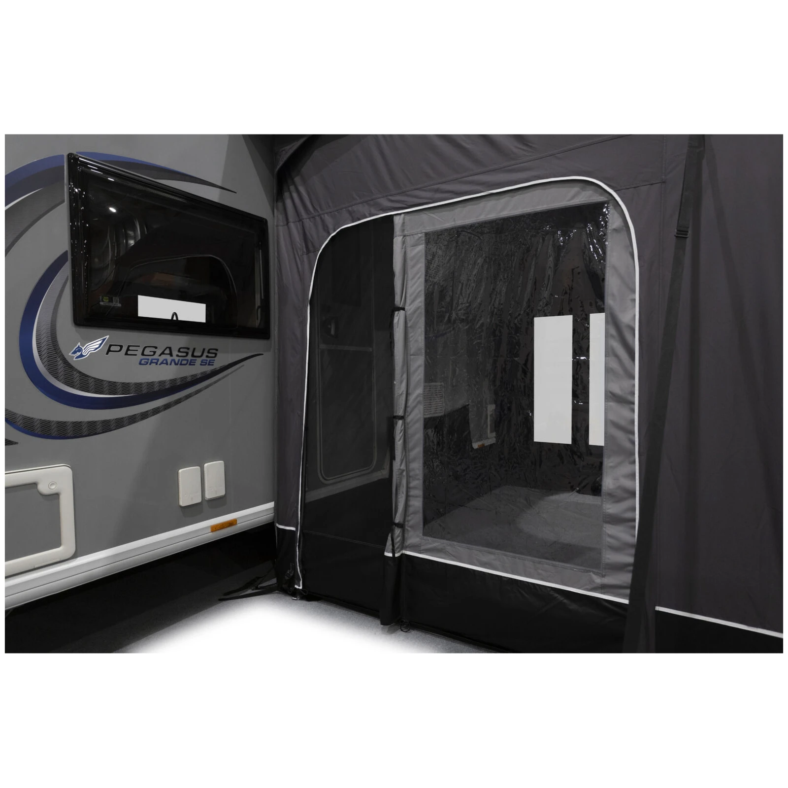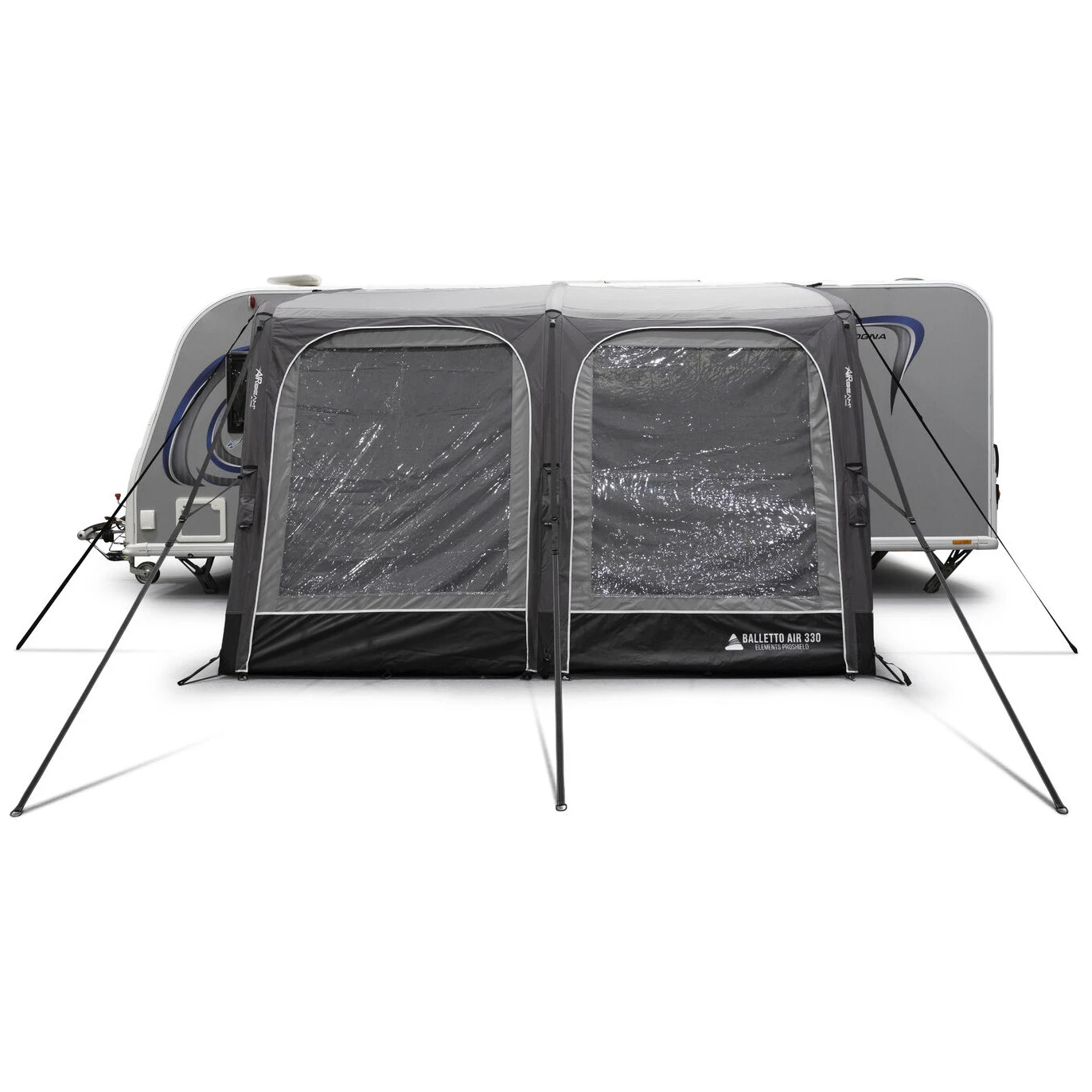 El toldo ofrece una vista panorámica en todas direcciones a través de grandes ventanas Diamond Pro, que son significativamente más resistentes que el diseño estándar y, al mismo tiempo, proporcionan un mejor aislamiento. Mediante los cierres de cremallera, se puede regular fácilmente la cantidad de luz y privacidad según la necesidad. Gracias a la disposición variable del espacio, el Balletto Pro Air 330 es adecuado tanto para el almacenamiento práctico de equipos como para comidas familiares, relajación o para ampliar el espacio para dormir.