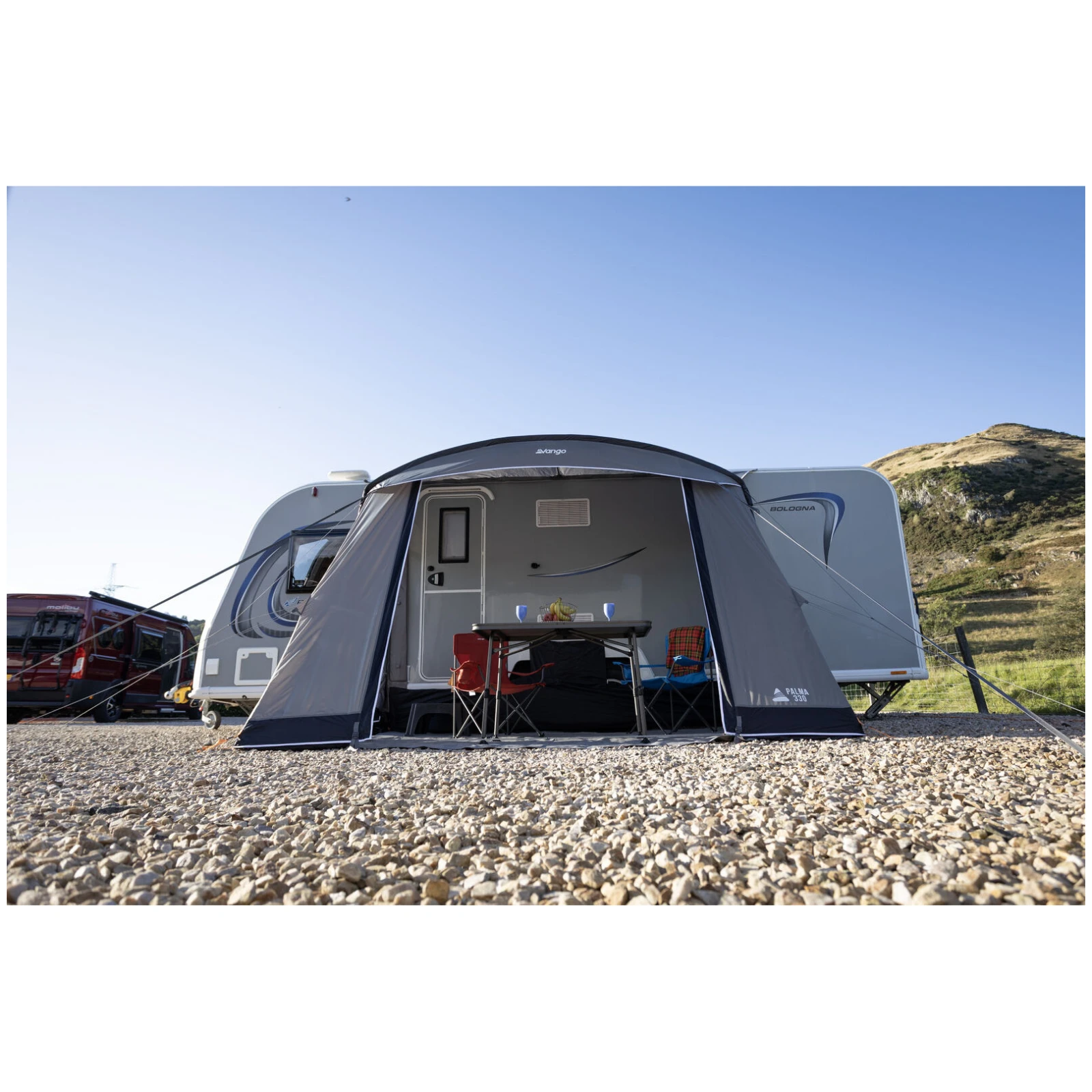 La tienda de campaña modelo Palma 330 de la marca Vango es una tienda de campaña turística ligera y práctica para caravanas, diseñada para viajeros que buscan un refugio fiable para escapadas de fin de semana o viajes más cortos. Gracias a su profundidad compacta de aproximadamente 2,4-2,5 m, cabe fácilmente incluso en parcelas más estrechas, sin necesidad de sacrificar el espacio interior o la comodidad.