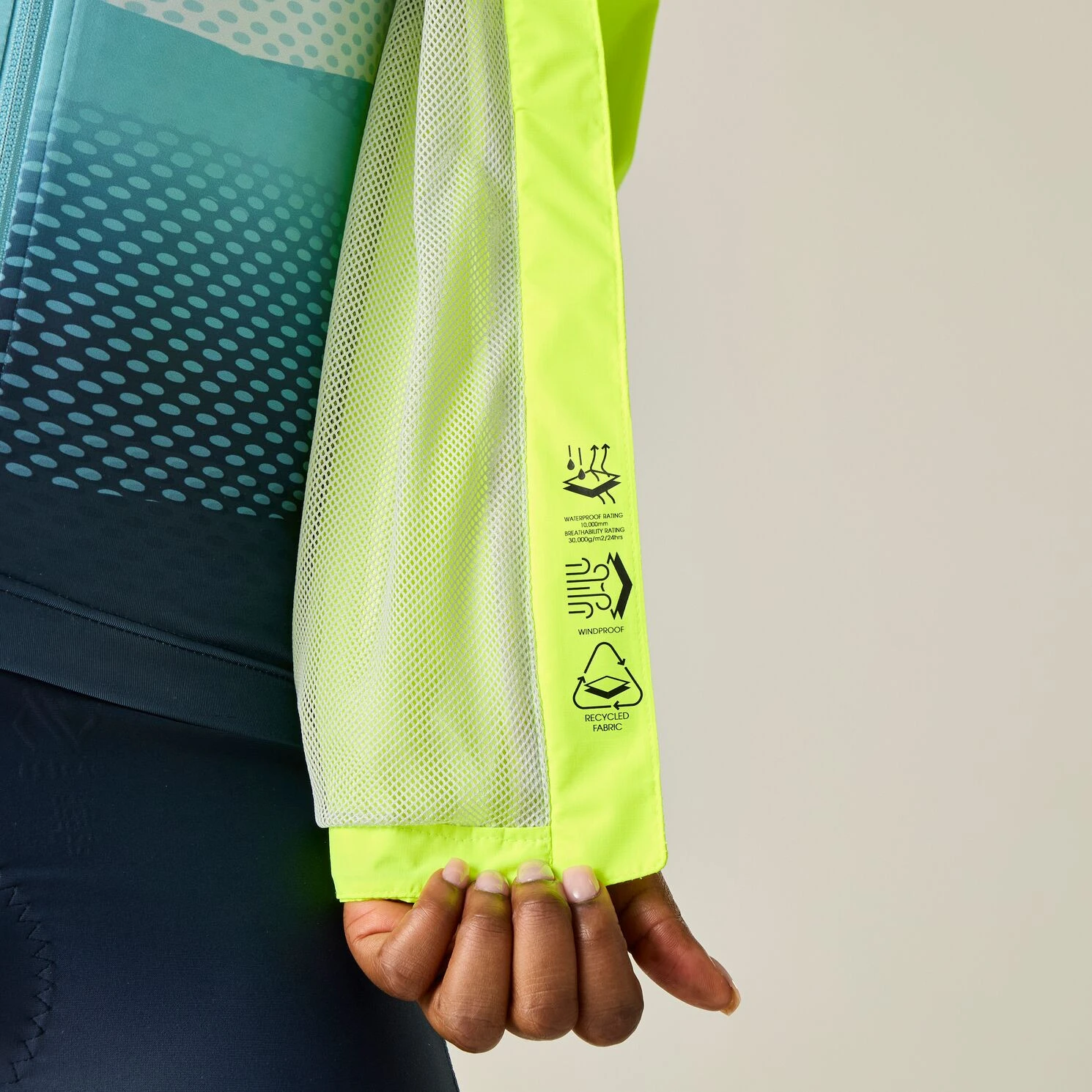 El material ARED 10/30K de poliéster reciclado proporciona una protección fiable contra la lluvia gracias a una columna de agua de 10 000 mm y, al mismo tiempo, ofrece una alta transpirabilidad de hasta 30 000 g/m²/24 h. Las costuras selladas y la cremallera impermeable evitan la penetración del agua, mientras que los paneles de ventilación en los laterales ayudan a regular la temperatura durante la conducción exigente.