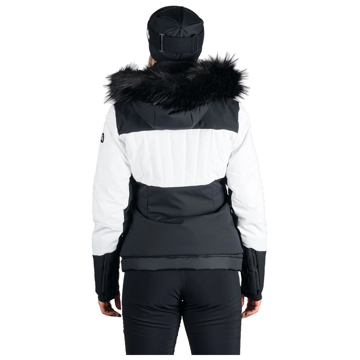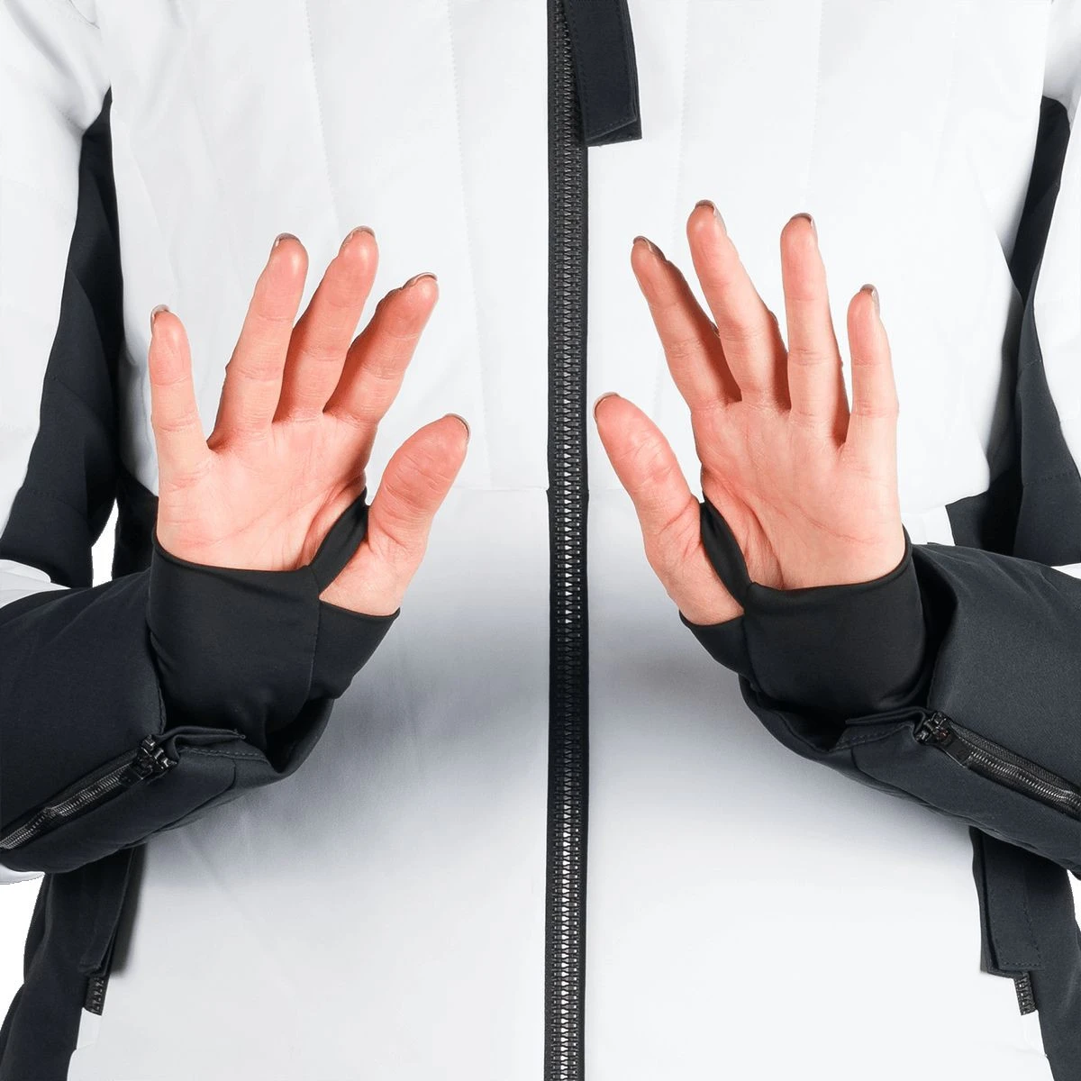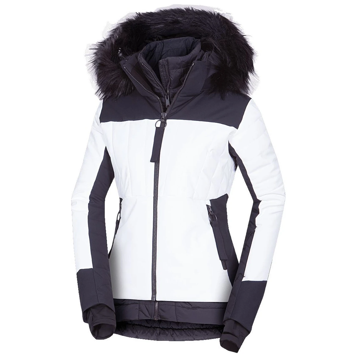 La chaqueta está equipada con dos bolsillos laterales, un bolsillo para el forfait en la manga, un bolsillo interior para las gafas y otro bolsillo interior con cremallera. La capucha con piel extraíble fija 3D completa un look moderno y femenino.