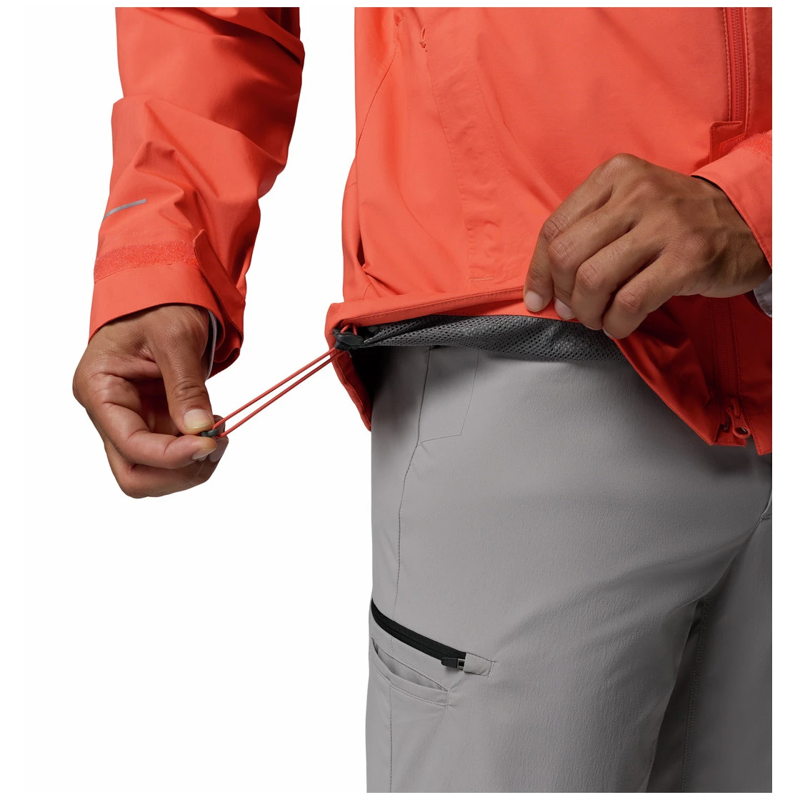 La capucha integrada con ajuste de circunferencia y visera laminada ayuda a proteger de la lluvia y el viento. Puños ajustables y dobladillo con cordón para adaptarse a las condiciones, mientras que la parte trasera extendida aumenta la cobertura de la espalda. La protección de la barbilla contribuye a la comodidad al abrochar completamente la chaqueta.