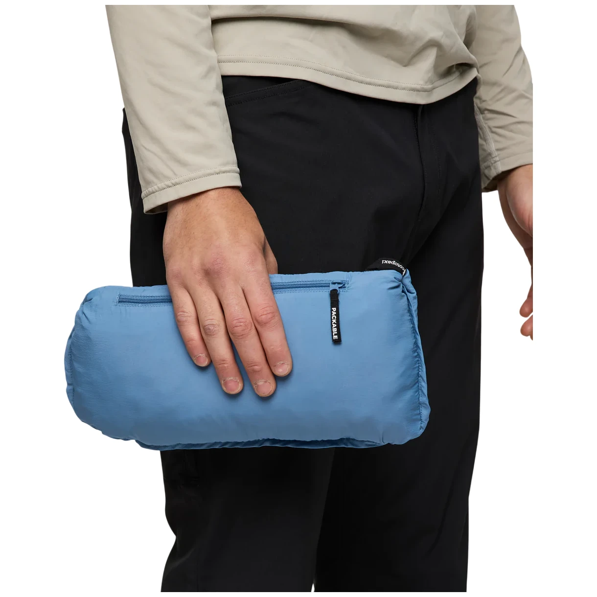 bolsillo con cremallera en el pecho en el que se puede guardar la chaqueta