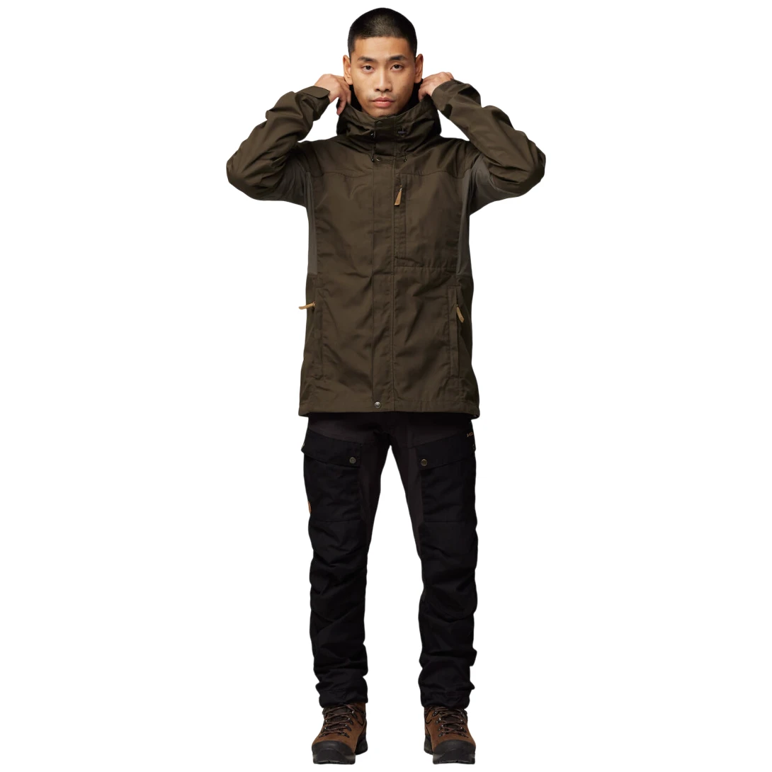La chaqueta para hombre Kaipak Jacket de Fjällräven está diseñada para proporcionar una combinación óptima de durabilidad, comodidad y libertad de movimiento tanto para el trekking como para el uso diario. La parte principal de la chaqueta está hecha de material G-1000®, que es resistente al viento y al agua y protege eficazmente contra las lluvias ligeras. Los paneles elásticos en las axilas y los laterales permiten una total libertad de movimiento y, al mismo tiempo, contribuyen a una mejor evacuación de la humedad, para que te mantengas seco y cómodo incluso durante actividades más exigentes.