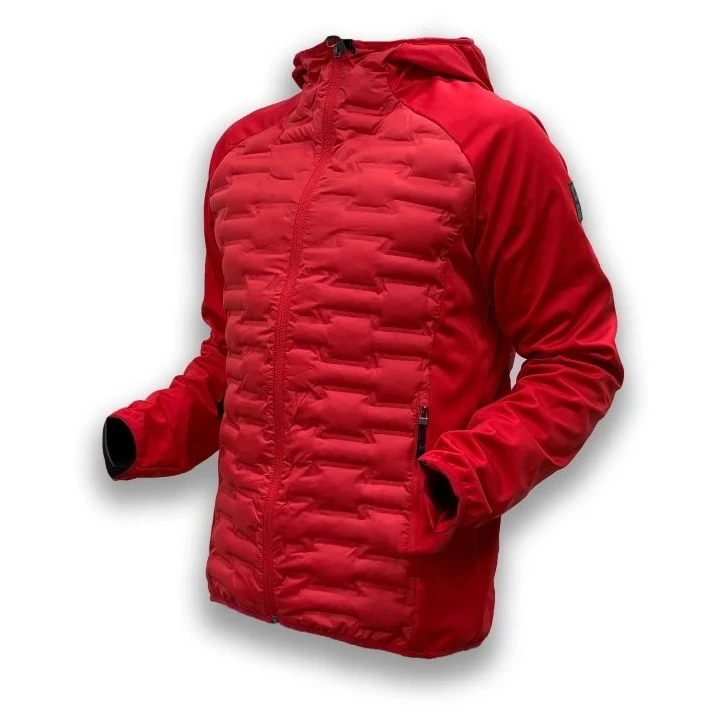 La combinación de un poliéster duradero con el acolchado y el uso de una tecnología especial sin costuras minimiza las fugas no deseadas del acolchado. El material softshell forma los paneles laterales y las mangas raglán y parte de la espalda en la parte inferior. La composición del material garantiza un calor agradable, ligereza, resistencia al viento y a la humedad.