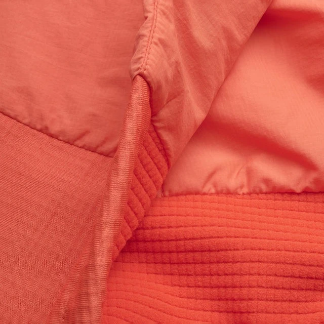 Los paneles laterales de forro polar reciclado Thermo Grid y el corte anatómicamente moldeado proporcionan la máxima libertad de movimiento y comodidad incluso durante las actividades dinámicas. Gracias a la capucha de perfil bajo, las costuras planas y el diseño minimalista, la chaqueta es ideal como capa aislante ligera o como chaqueta independiente en condiciones más suaves.
