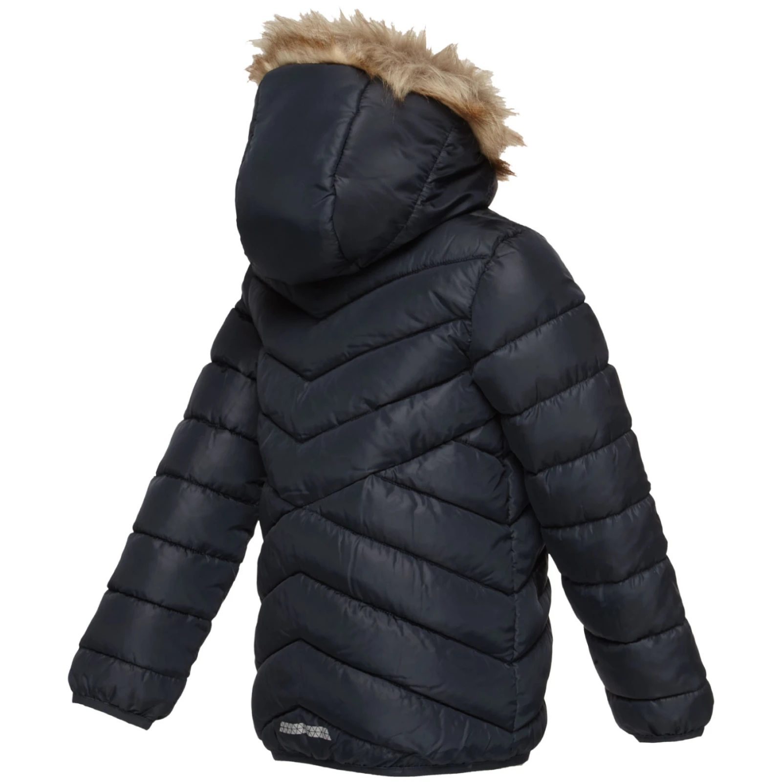 El dobladillo y los extremos de las mangas elásticos garantizan que la chaqueta se ajuste perfectamente y mantenga el calor. Las características de seguridad, como la cremallera ósea con protección para la barbilla y los detalles reflectantes, aumentan la seguridad de su hijo cuando se desplaza al aire libre. La elegante capucha con pelo no extraíble confiere a la chaqueta un aspecto moderno y proporciona una protección adicional contra el frío.