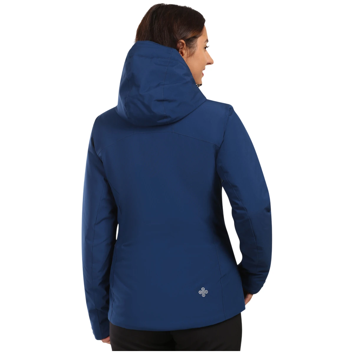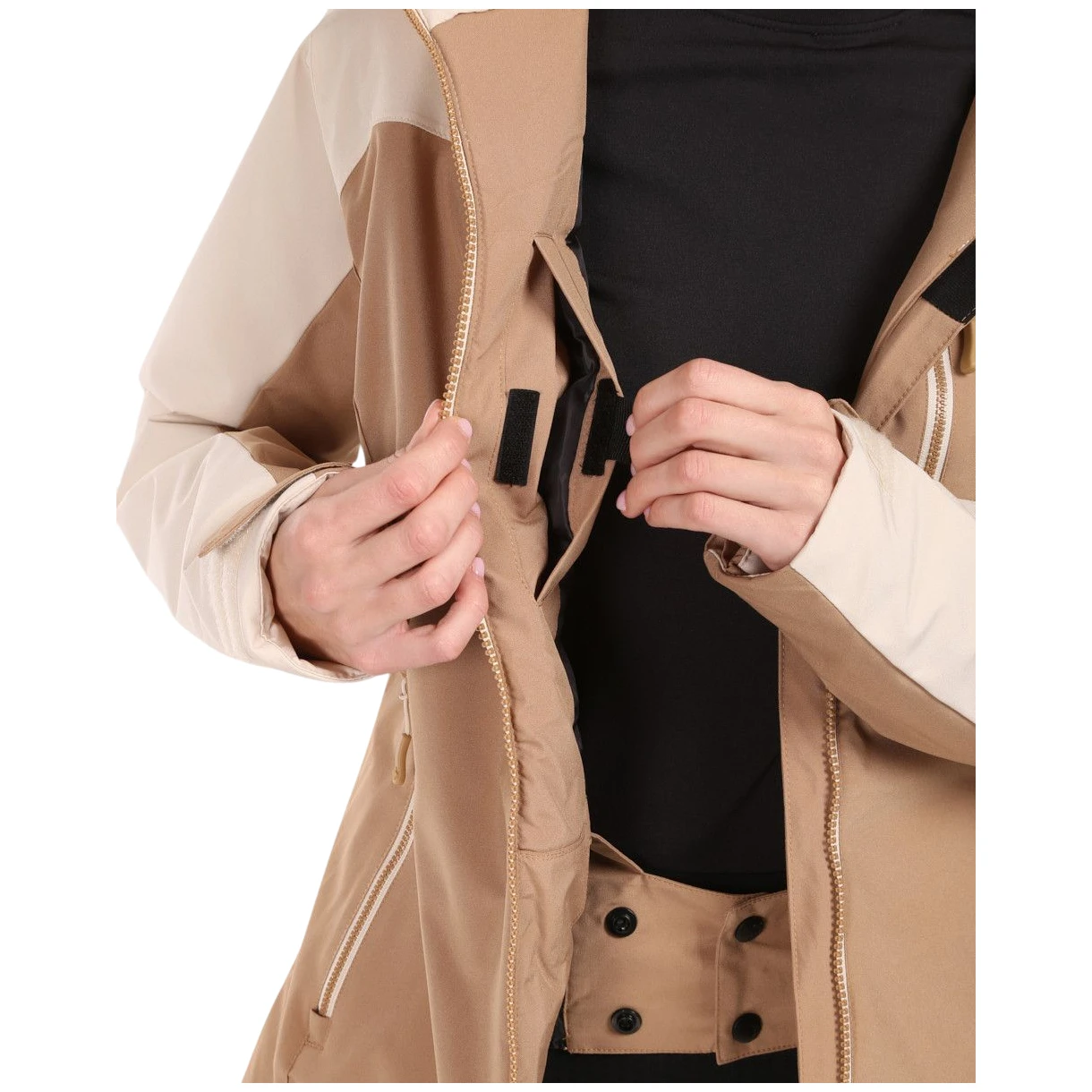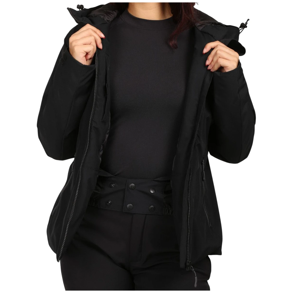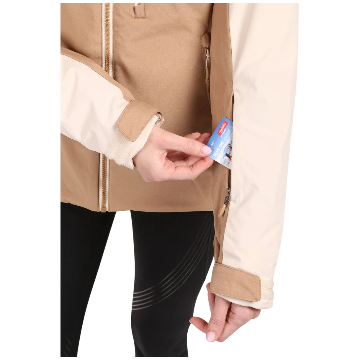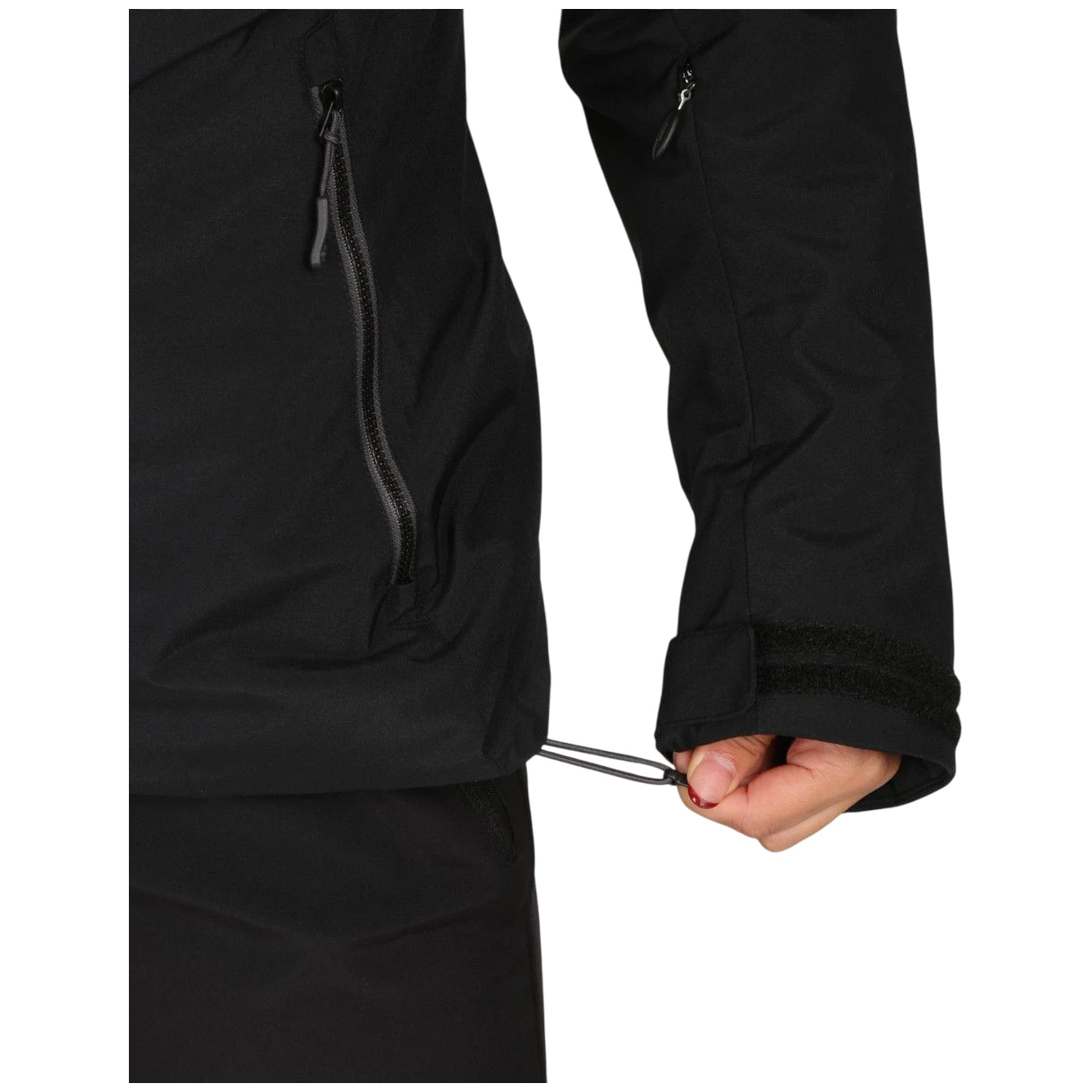 La chaqueta cuenta con una capucha desmontable y ajustable, un faldón antinieve y dos bolsillos principales con cremallera. Además, está equipada con un bolsillo para el forfait en la manga y un bolsillo interior para objetos de valor. Las mangas se pueden ajustar con velcro y el dobladillo inferior es ajustable con una goma elástica.