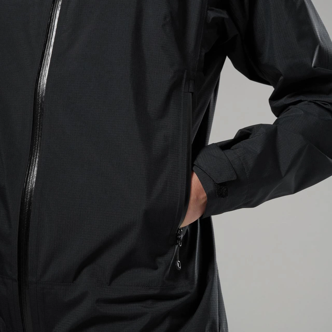 La base está hecha de material Pertex® Shield 2.5 L, que combina tejido ripstop 40D reciclado con una membrana impermeable y cortavientos. El forro interior de tricot 20D es agradable al tacto y aumenta la comodidad al usarlo. La construcción está diseñada con énfasis en peso ligero y funcionalidad, mientras que un número limitado de costuras ayuda a aumentar la durabilidad al tiempo que favorece la transpirabilidad durante el movimiento activo.