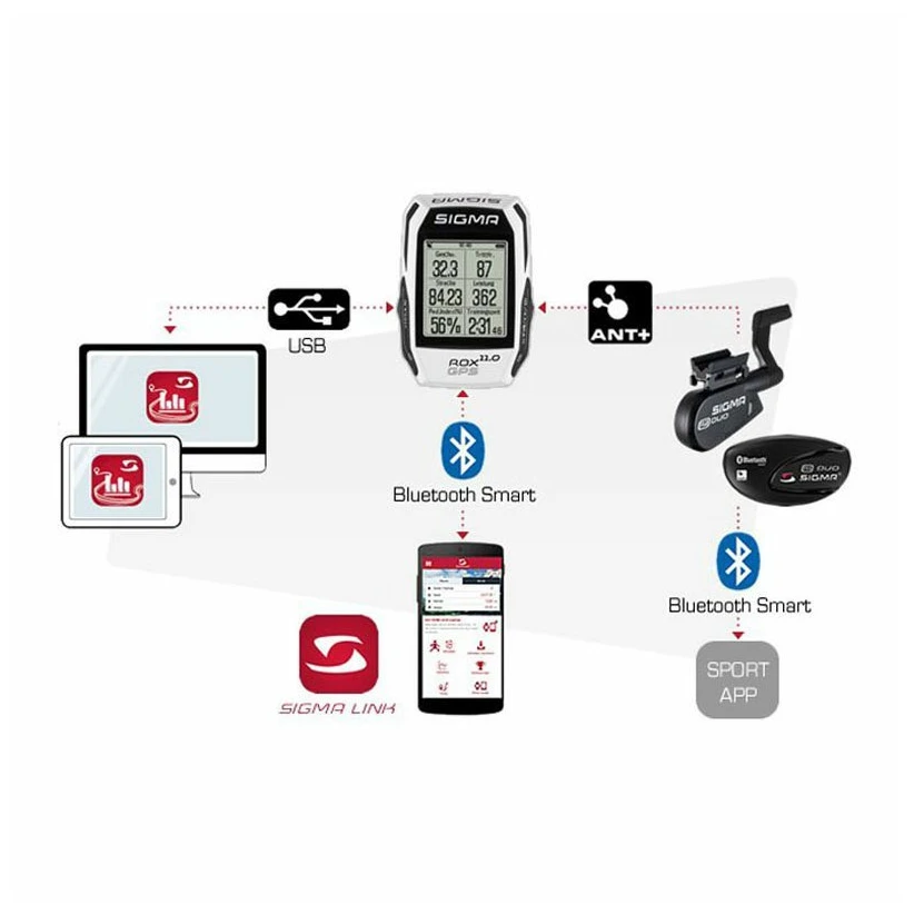 Bluetooth permite la conexión entre el teléfono inteligente y el GPS ROX 11.0 y la descarga de datos a la aplicación gratuita Sigma Link. Puedes descargar tus datos de entrenamiento en la app y también configurar tu ROX. La aplicación Sigma Link puede sincronizar sus datos a través de la Sigma Cloud con la aplicación Sigma Data Center. El GPS Rox 11.0 junto con la aplicación Link Sigma le notifica sobre llamadas o mensajes entrantes.