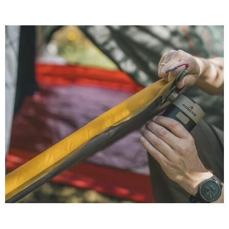 La superficie está hecha de nailon muy resistente con doble ripstop y laminación de TPU. Gracias a sus dimensiones mínimas de embalaje, cabe en casi cualquier equipaje. La válvula de pico eficiente ayuda a un inflado rápido.
