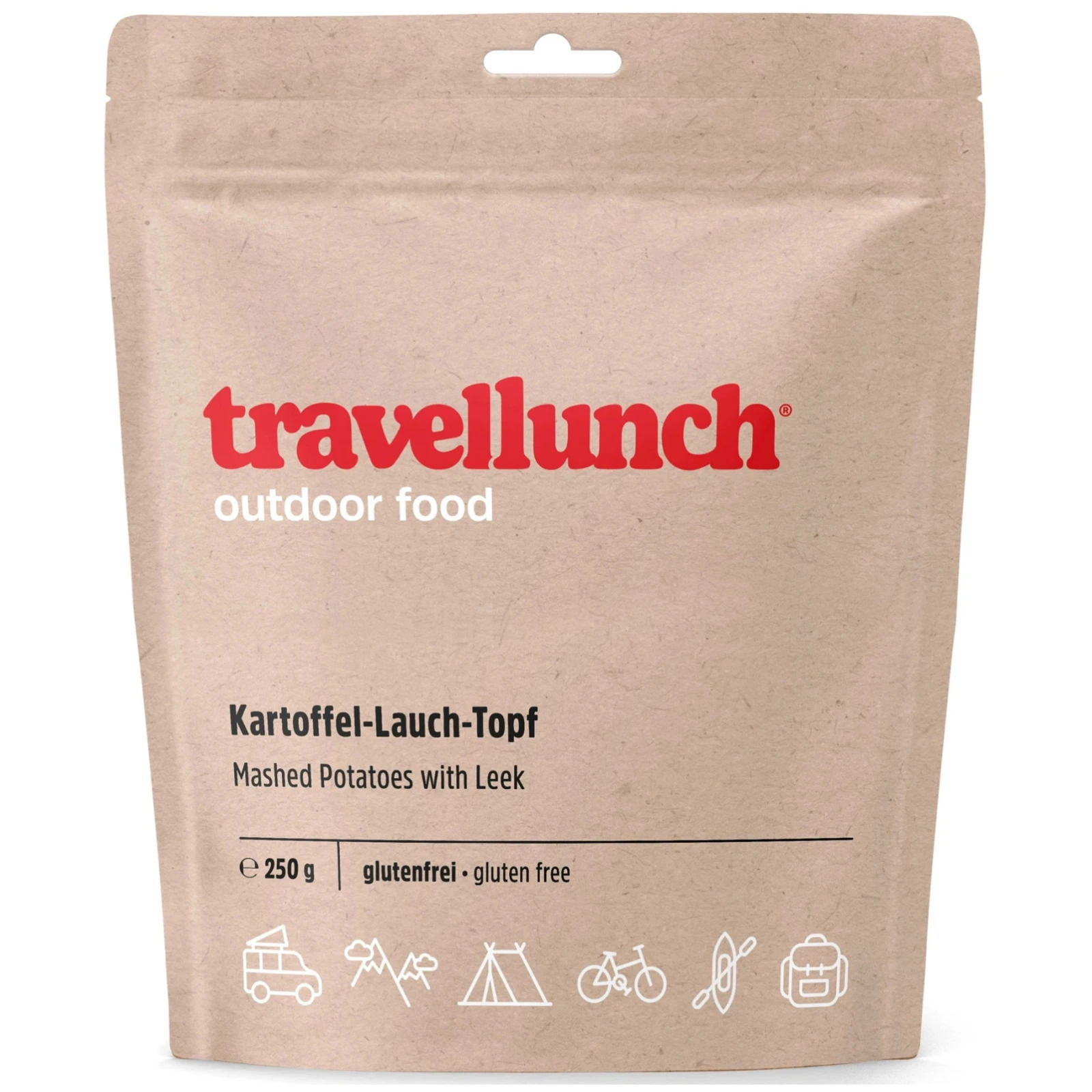 Alimento deshidratado profesional Travellunch Puré de patatas con puerros sin gluten contiene todas las sustancias importantes para el cuerpo humano, incluso en situaciones de rendimiento extremo, y además tiene un delicioso sabor.