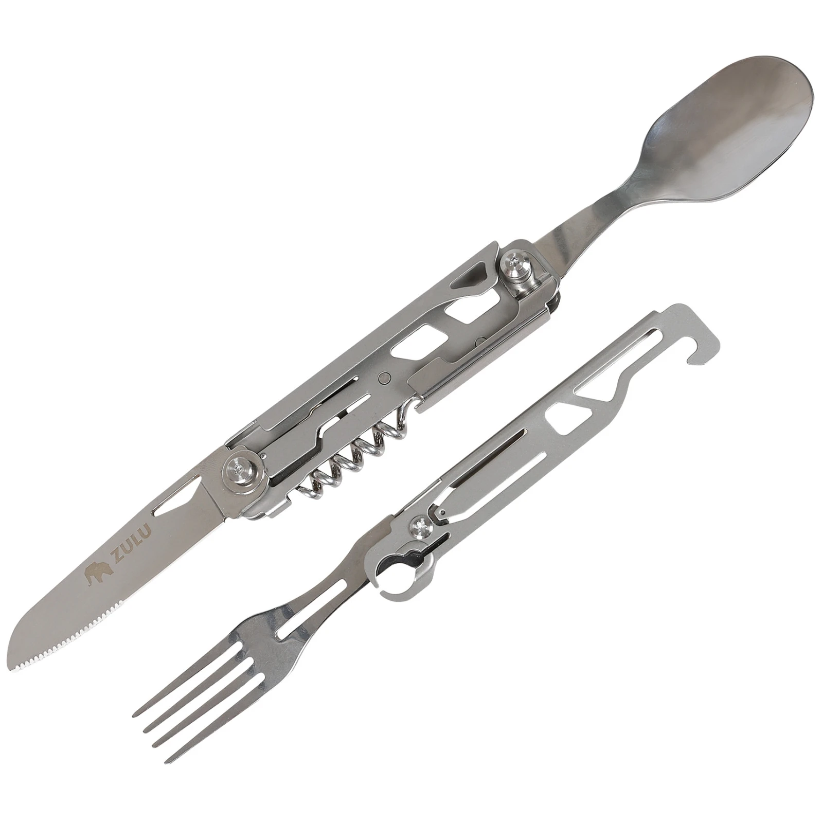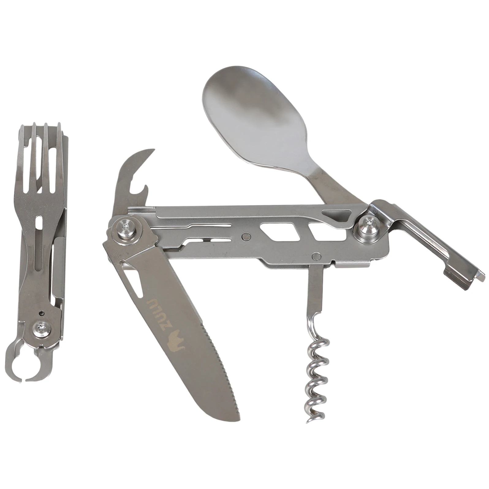 El Zulu Multispork 6in1 es un práctico cubierto multifuncional que combina seis herramientas en un solo paquete compacto. En el cuerpo de acero inoxidable encontrarás un cuchillo, una cuchara, un sacacorchos, un abridor de botellas, un abrelatas y un tenedor desmontable. Gracias a su inteligente sistema de diseño, el tenedor se puede separar fácilmente del resto de las piezas y utilizar ambos cubiertos cómodamente al mismo tiempo.