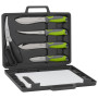 Juego de barbacoa Cattara 4+1+1 que consta de 4 cuchillos, tijeras para aves y pescado y tabla de cortar para porcionar cómodamente. Todo el conjunto está perfectamente colocado en un maletín de transporte. Puede utilizar el conjunto tanto en casa, en el jardín, como de viaje.