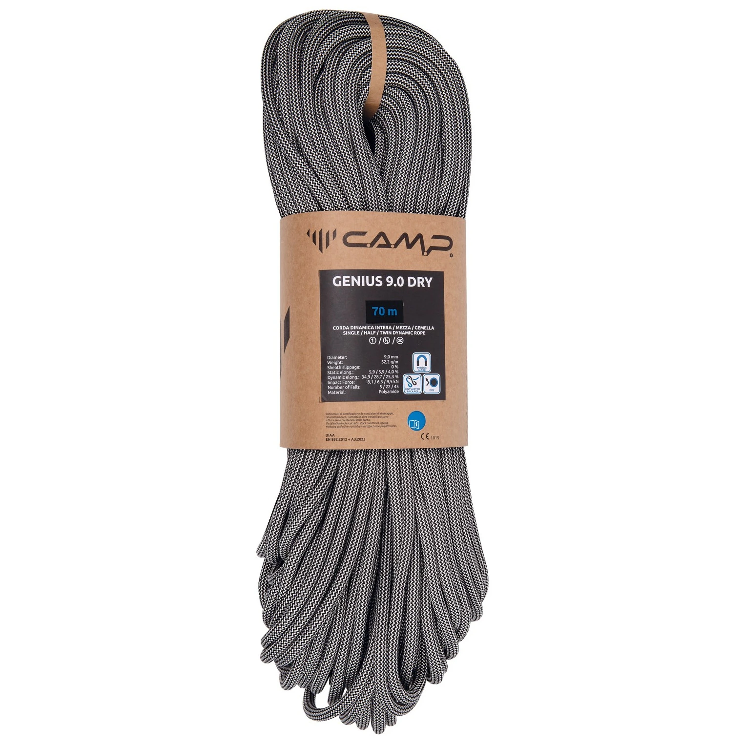 Genius 9.0 Dry - 70m de Camp es una de las cuerdas más ligeras de 9.0 mm del mercado. Triple clase de resistencia y tratamiento seco lo hacen listo para el gran terreno. Tratamiento seco - ayuda a repeler la humedad, la suciedad y la grava que pueden dañar la cuerda con el tiempo debido a un uso intensivo. Marcas de tinta indican el centro de la cuerda para un manejo más fácil y descensos seguros. La combinación de un manejo suave y una buena elongación dinámica hace que la cuerda sea el compañero ideal para el alpinismo.