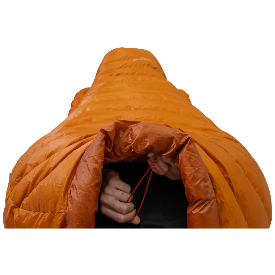 La construcción optimiza el loft y la eficiencia térmica sin volumen innecesario. Tiene un relleno de plumón de pato con un poder de relleno de 850 cuin y una proporción de plumón de 90/10, que aísla perfectamente. A ello contribuye el cuello térmico de nueva forma, que envuelve firmemente los hombros y evita la pérdida de calor. La capucha tiene cordones a ambos lados. La cómoda forma de momia 3D mejora el aislamiento térmico y proporciona comodidad. El espacio alrededor de los pies está especialmente adaptado con forma de aleta de tiburón, lo que permite que las piernas permanezcan estiradas en una posición natural durante la noche y proporciona aislamiento adicional.